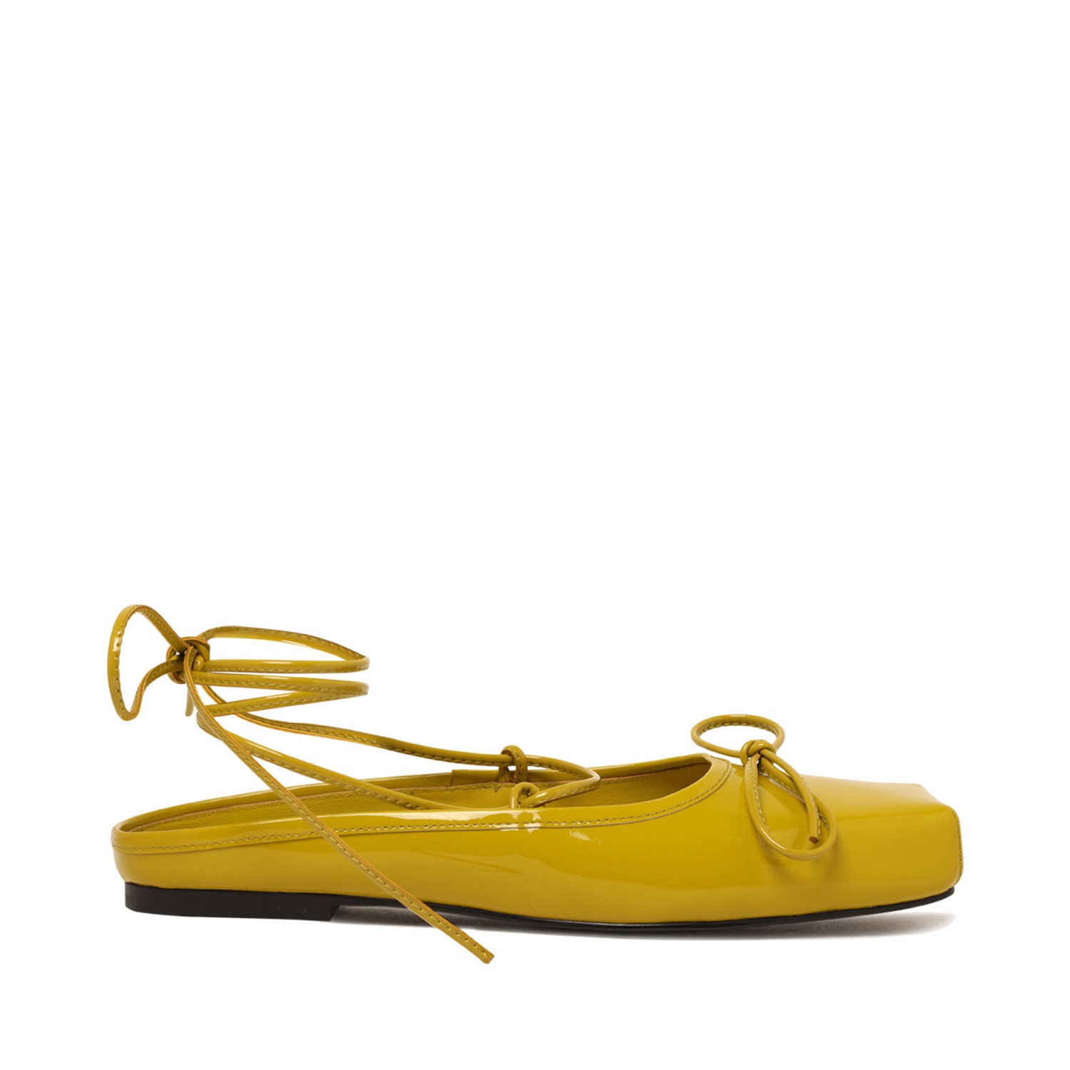 Hui Lime Ballet Flats. Lime patent leather ballet flats, square toe, lace-up fastening with wraparound ankle ties. Decorative bow detail at the front, cushioned insole, branded insole.