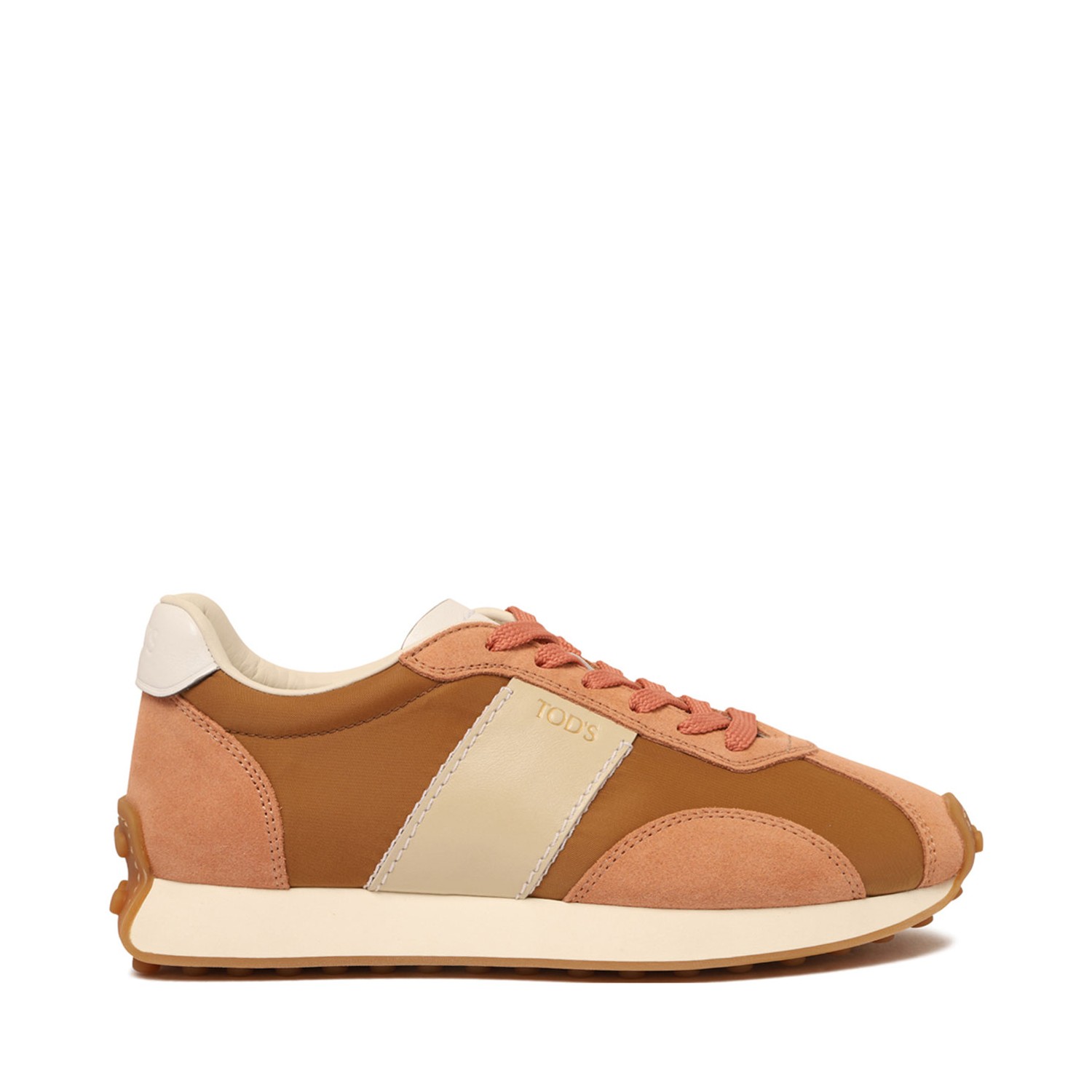 Tod's Light Brown and Pink Sneakers. Light brown suede and pink leather sneakers, lace-up fastening, round toe. Branded insole, embossed logo on the side, rubber sole with signature pebbled detailing.