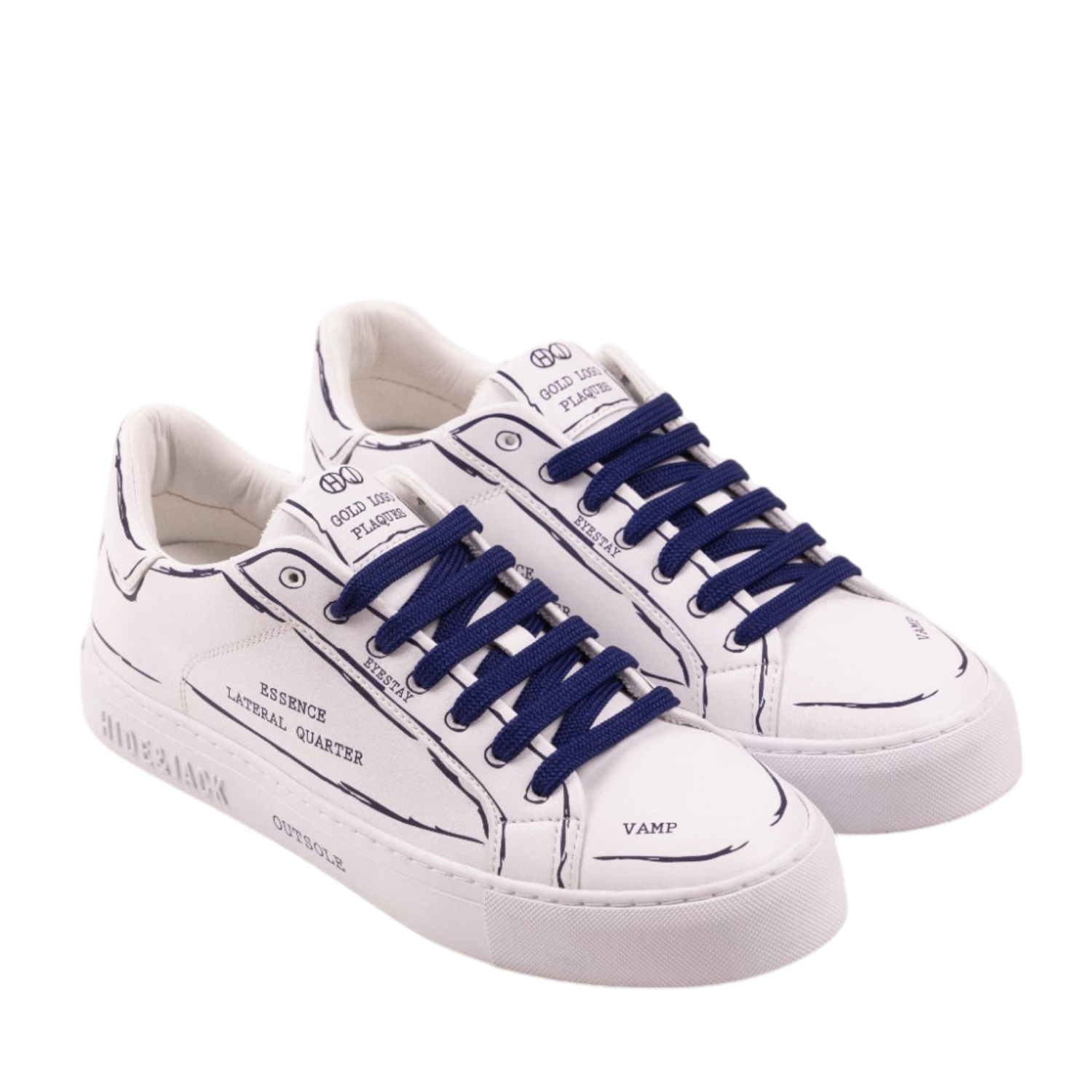 Hide & Jack White and Blue Sky Sneakers. White and blue low-rise sneakers crafted from action leather, featuring a leather croco-printed spoiler for an added touch of luxury. The rubber sole ensures maximum comfort and durability, making these designer sneakers perfect for any occasion. The fussbett and lining are also made from full leather, providing both style and comfort. The Sky designer sneaker offers the perfect blend of style and elegance.