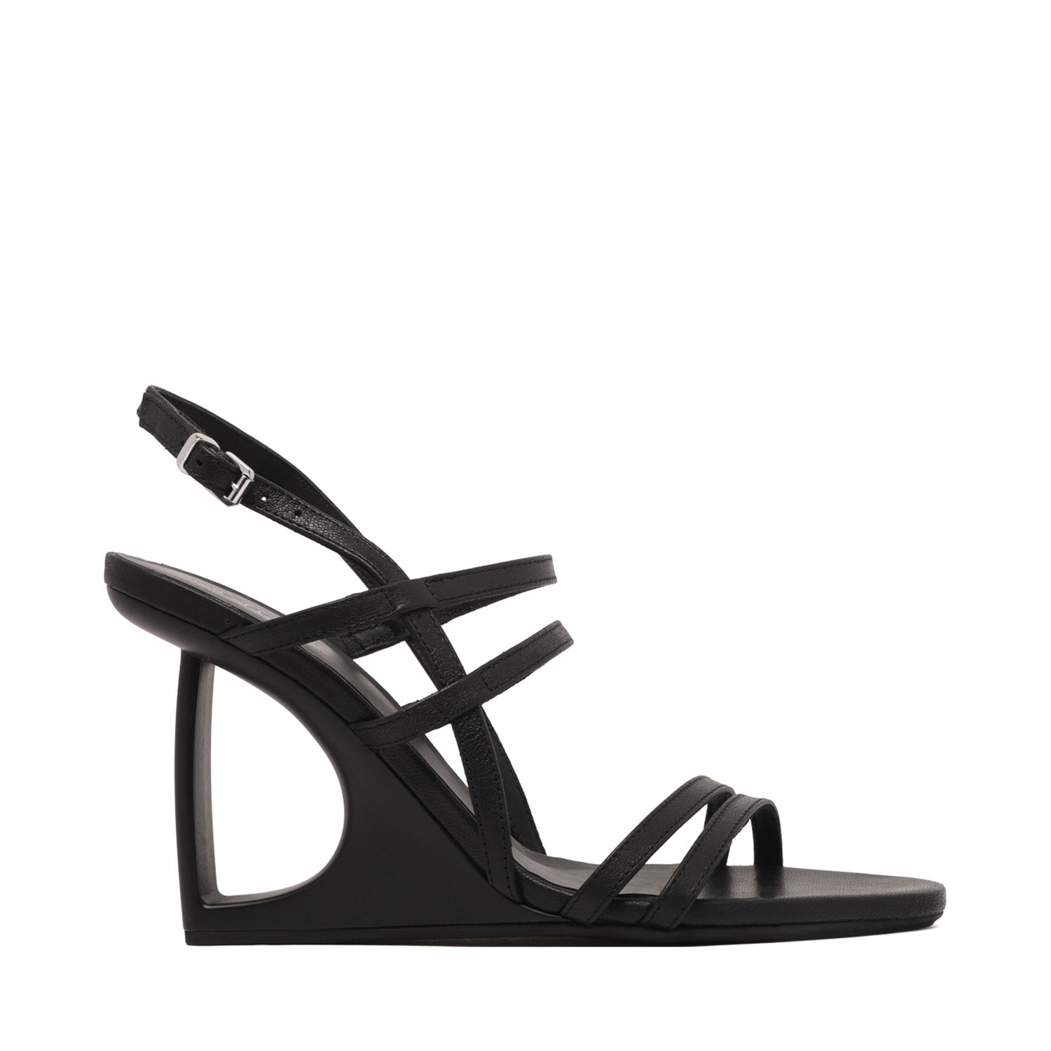 Vic Matie Black Logic Sandal. Black sculptural wedge sandals with buckle-fastening ankle strap, geometric high wedge heel, open-toe design, and minimalist multi-strap construction.