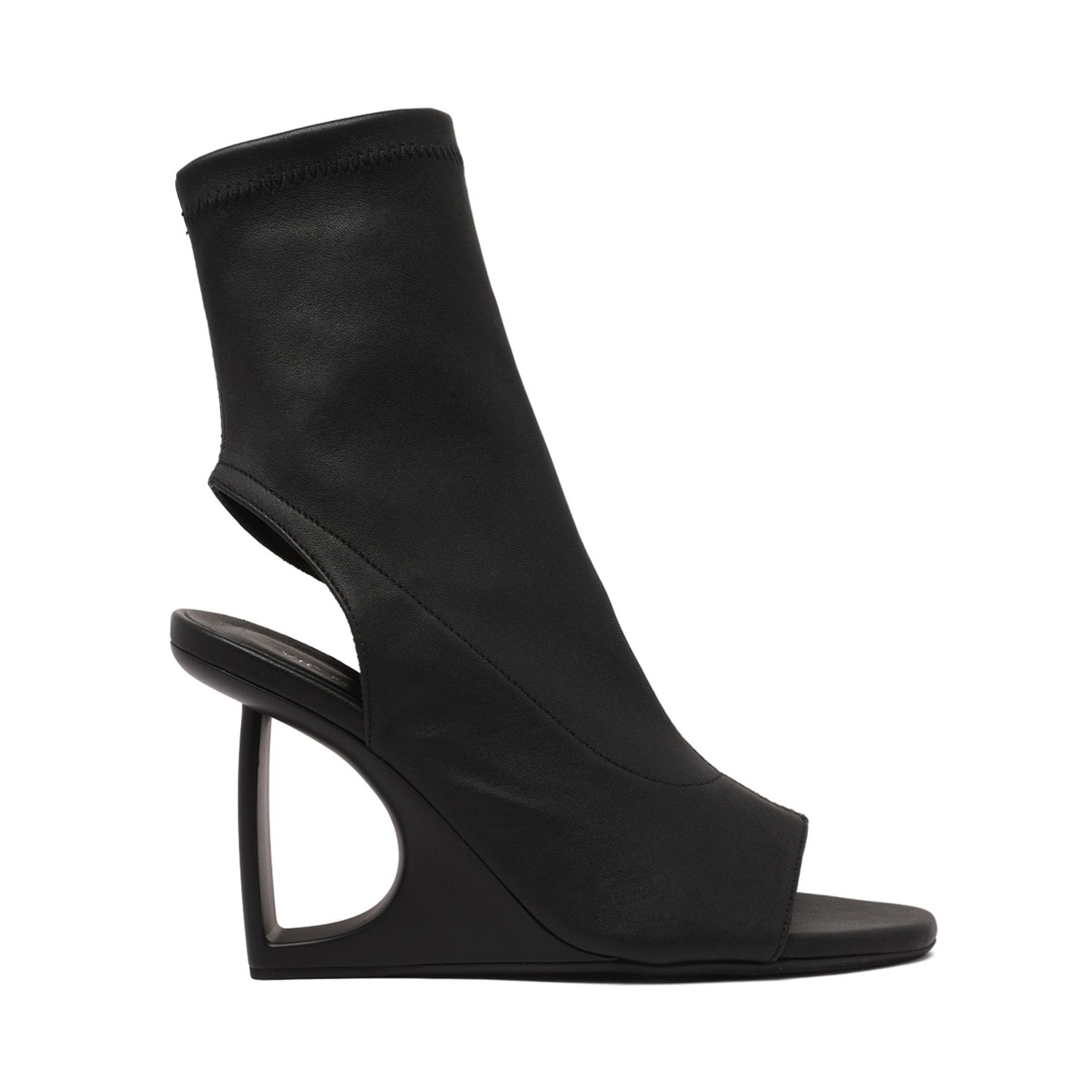 Vic Matie Black Pulp Sandal. Black open-toe sock wedge sandals with a sculptural high wedge heel, sleek leather upper extending to ankle height, cut-out heel detail, and contemporary minimalist design.