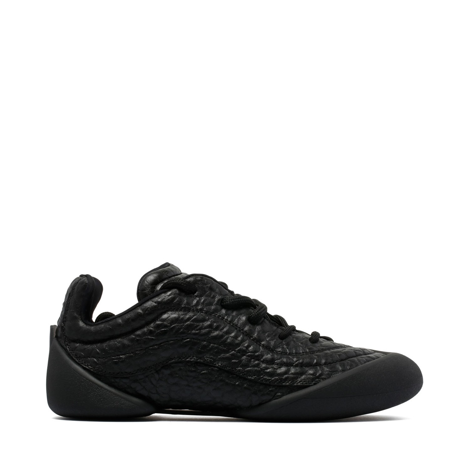 Alexander McQueen Black Flexion Sneakers. Black low top sneakers, ergonomic design with an anatomical feel. Soft black leather is contrasted with bold tubular shoelaces.