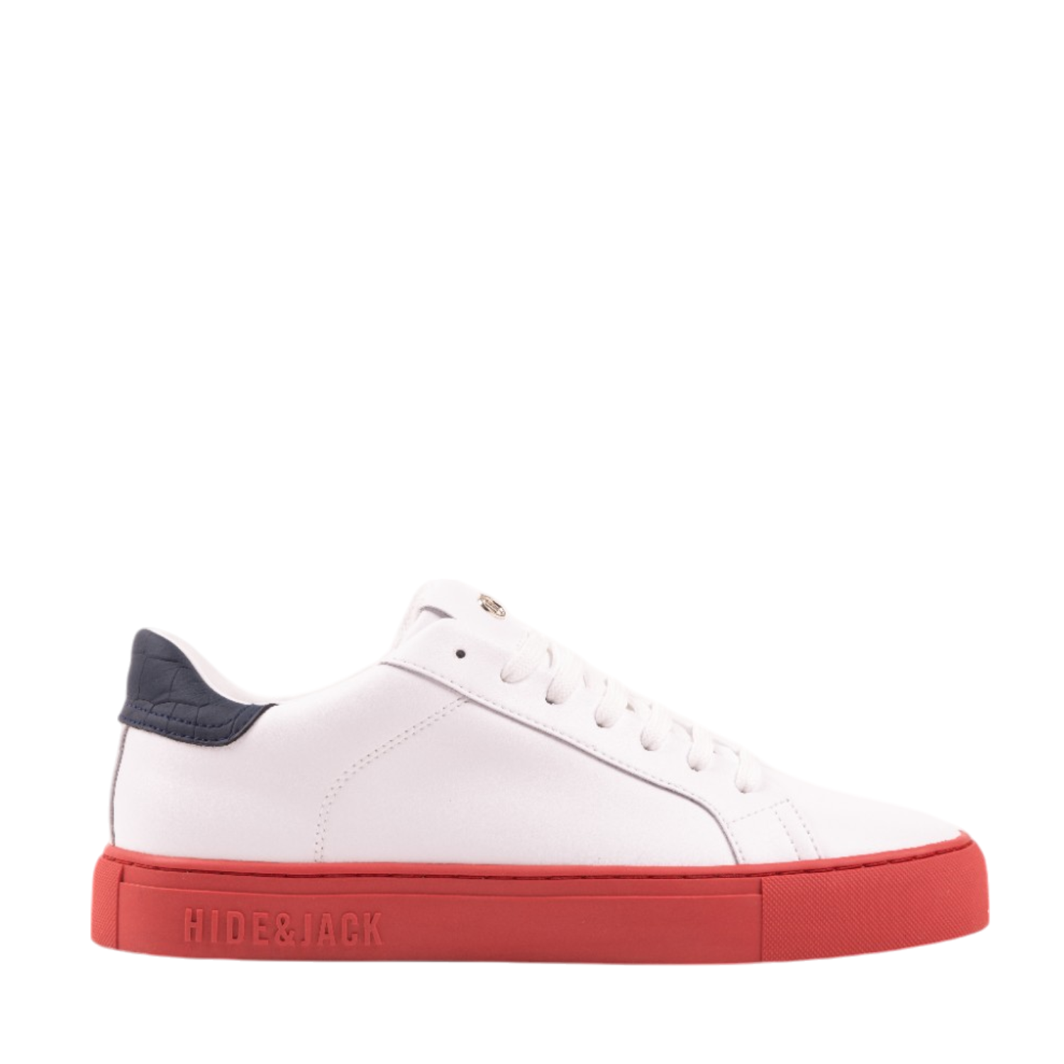 Hide & Jack Sky Blue and Red Sneakers. White, blue and red low-rise designer sneakers are elegant and casual. The white upper is complemented by a bold and eye-catching red bottom, creating a unique and fashionable look that will elevate any outfit. These sneakers are the ultimate combination of style and comfort, providing the perfect balance of fashion and function.