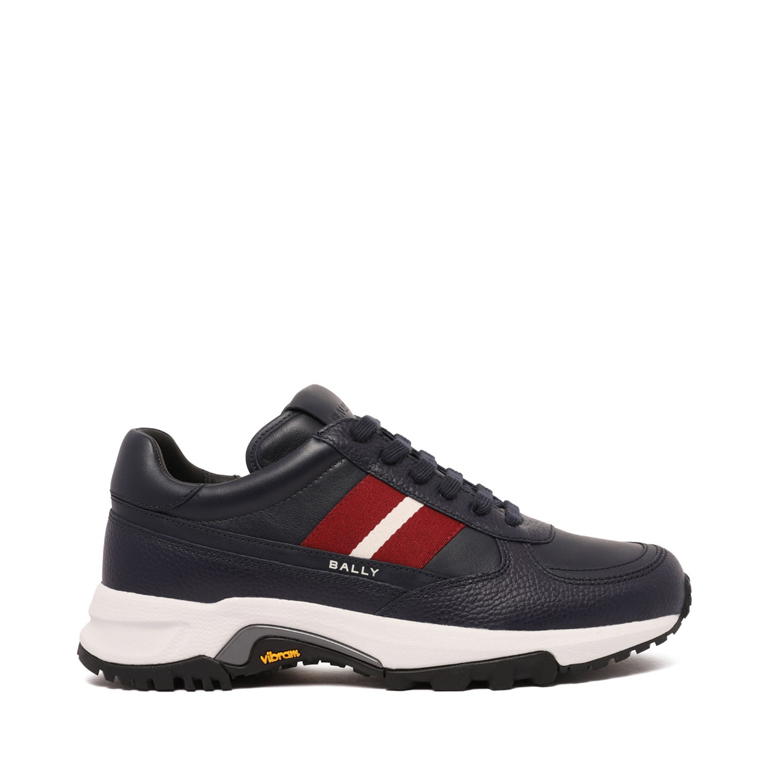 Bally Blue Flick Ribbon Trainers. Blue calf leather trainers with smooth grain, front lace-up fastening, side stripe detailing. Logo print to the side, round toe and flat rubber sole.