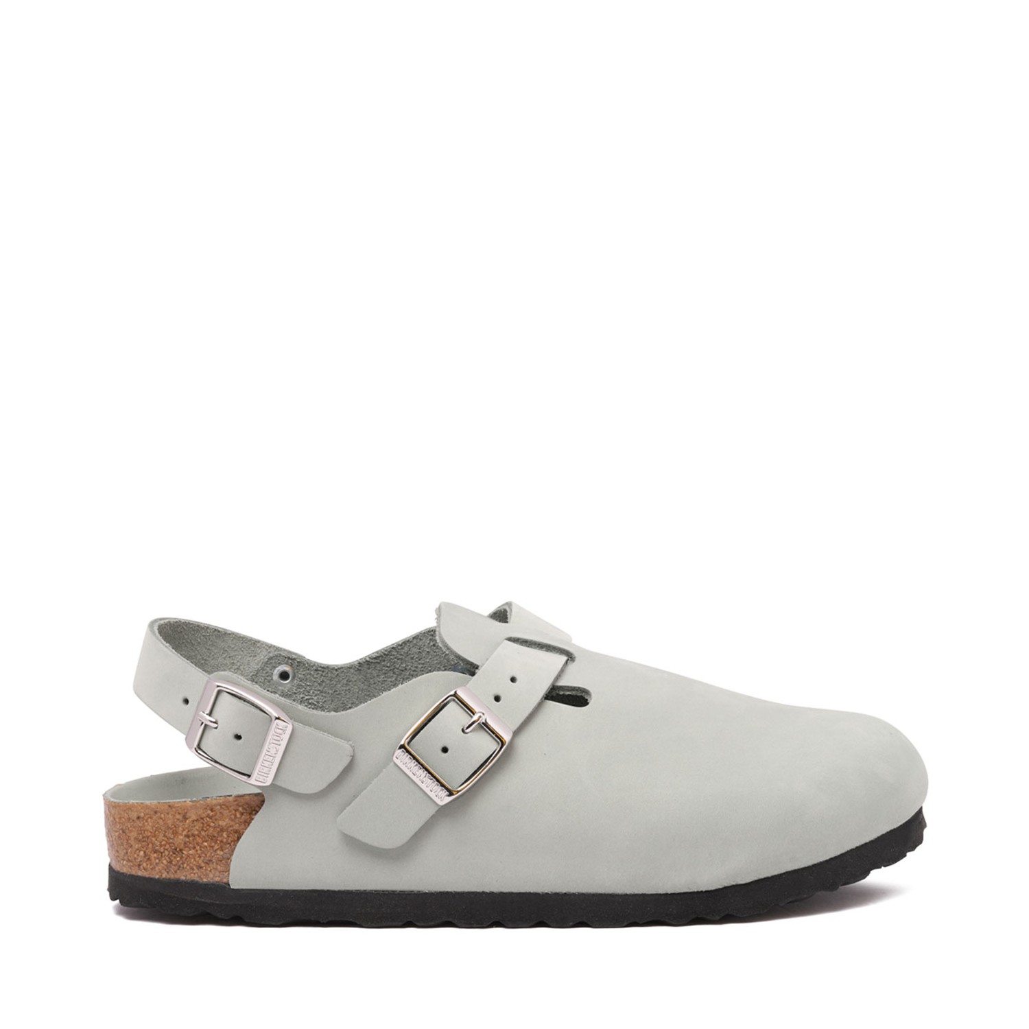 Birkenstock Tokyo Slippers. Sage green slippers with buckle-fastening slingback strap, branded leather insole, EVA midsole, cork sole.