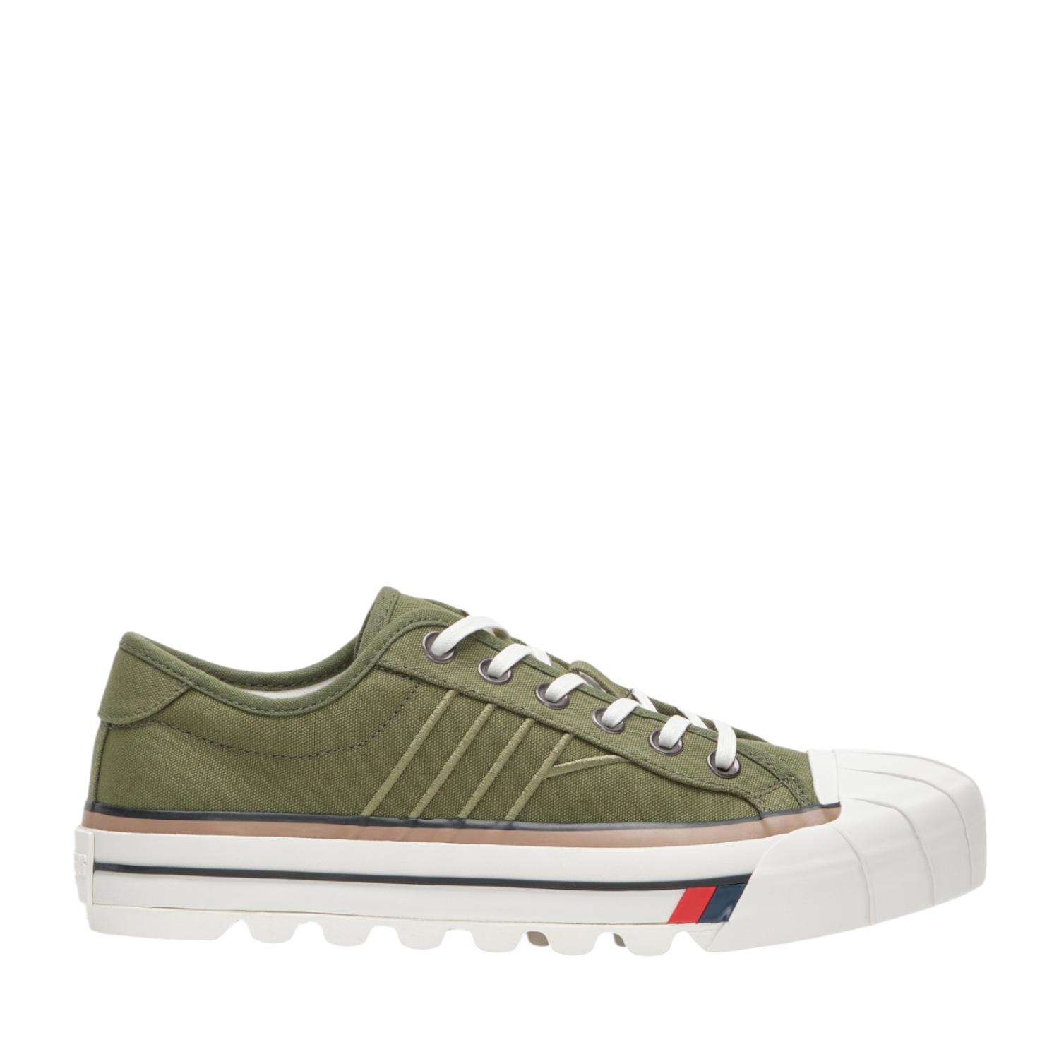 Pro-Keds Royal Moss Green Sneakers. Moss green canvas sneakers with lace-up closure, tonal stitched logo on the side, and reinforced rubber toe cap. Contrast stripe detailing on the midsole with signature red and navy color accents. Chunky white outsole with lug tread for enhanced grip and a sporty finish.