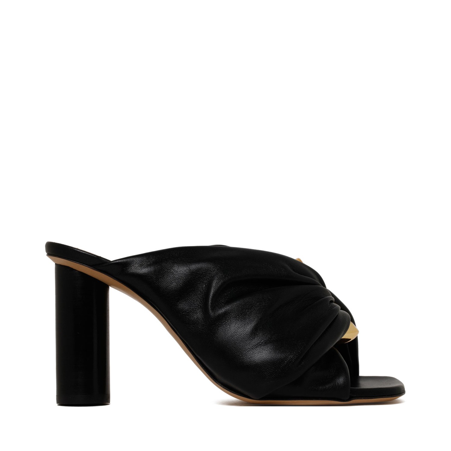 JW Anderson Black Corner Mules. Black leather mules, twist detailing, slip on style. Open toe, branded insole, high block heel.