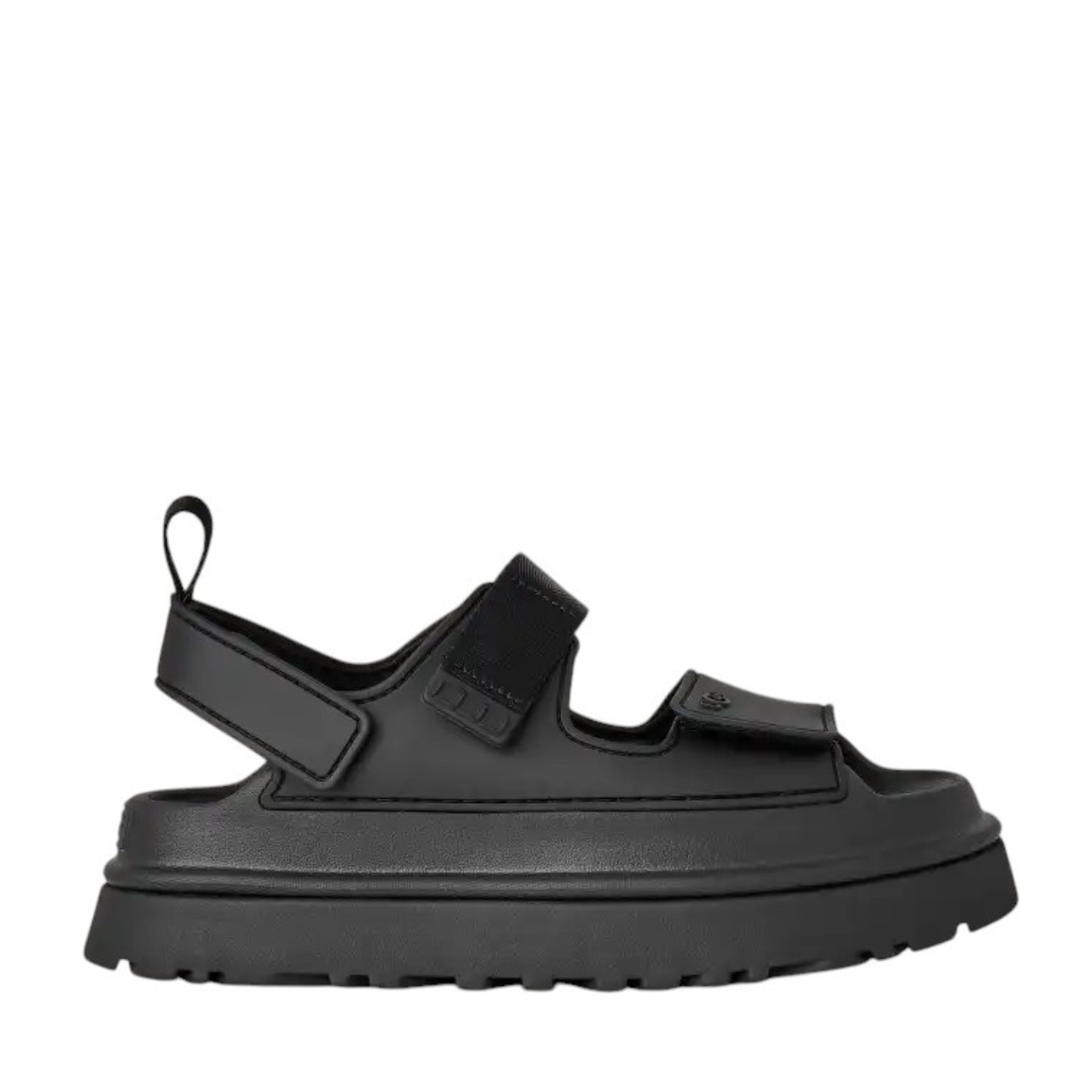 UGG Black Goldenstar Hi Sandal. Black sandal with leather upper, padding, rear tie. Adjustable ankle strap, velcro closure, Molded EVA insole. Suede-lined overlay midsole, Reground recycled EVA midsole, EVA sole from sugar cane, recycled polyester edge.