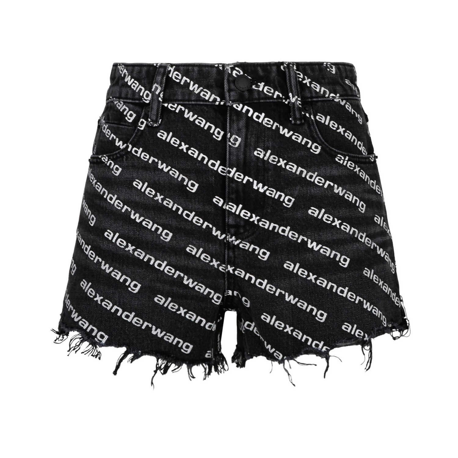 Alexander Wang Black All Over Logo Print Shorts. Black high waisted worn effect shorts in distressed gray denim with logo print. Leather logo applique on the back of the waistband.