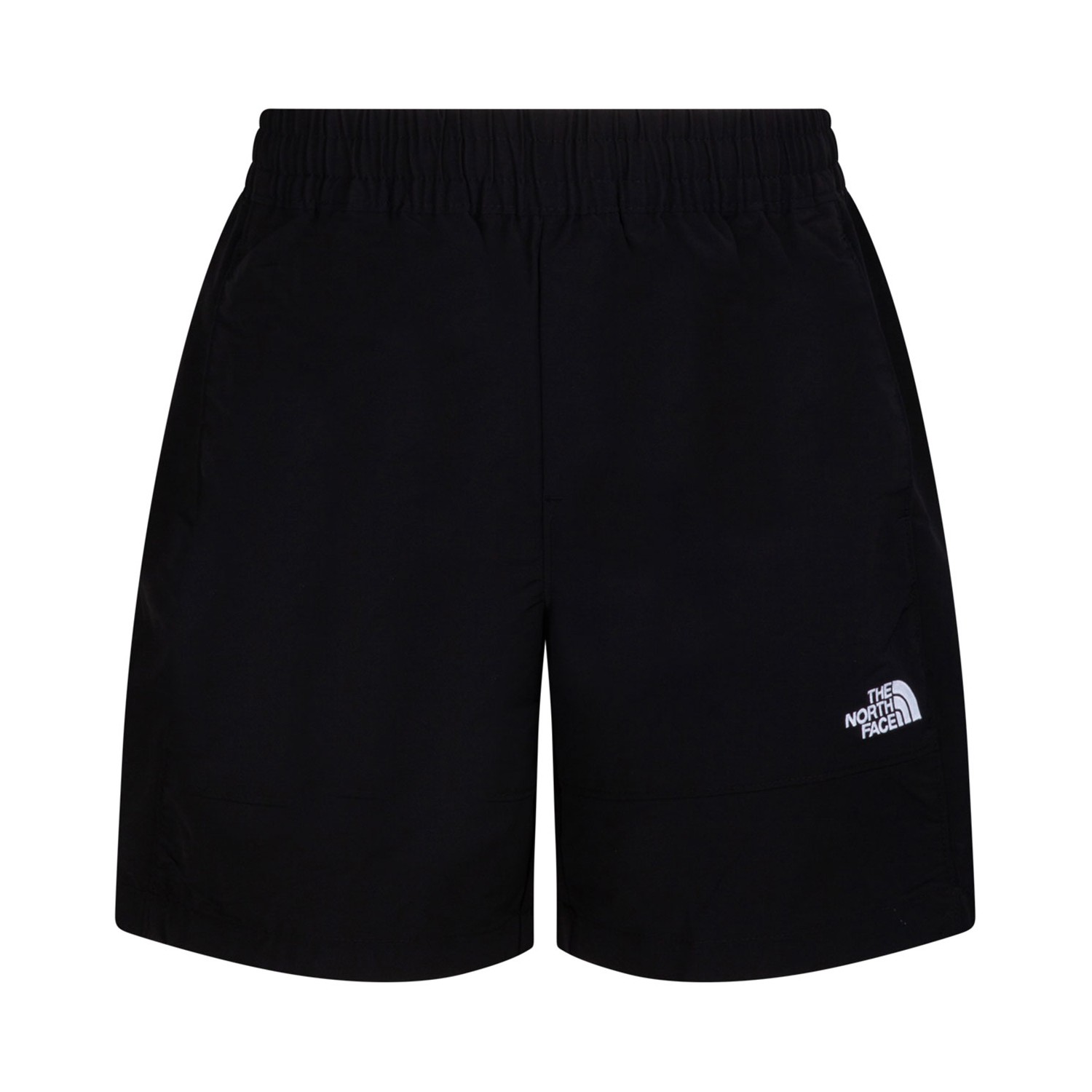 The North Face Black Wind Track Shorts. Water-repellent, wind-resistant, embroidered logo to the front and rear, elasticated waistband with internal drawstring, two side inset pockets, rear zip-fastening pocket.