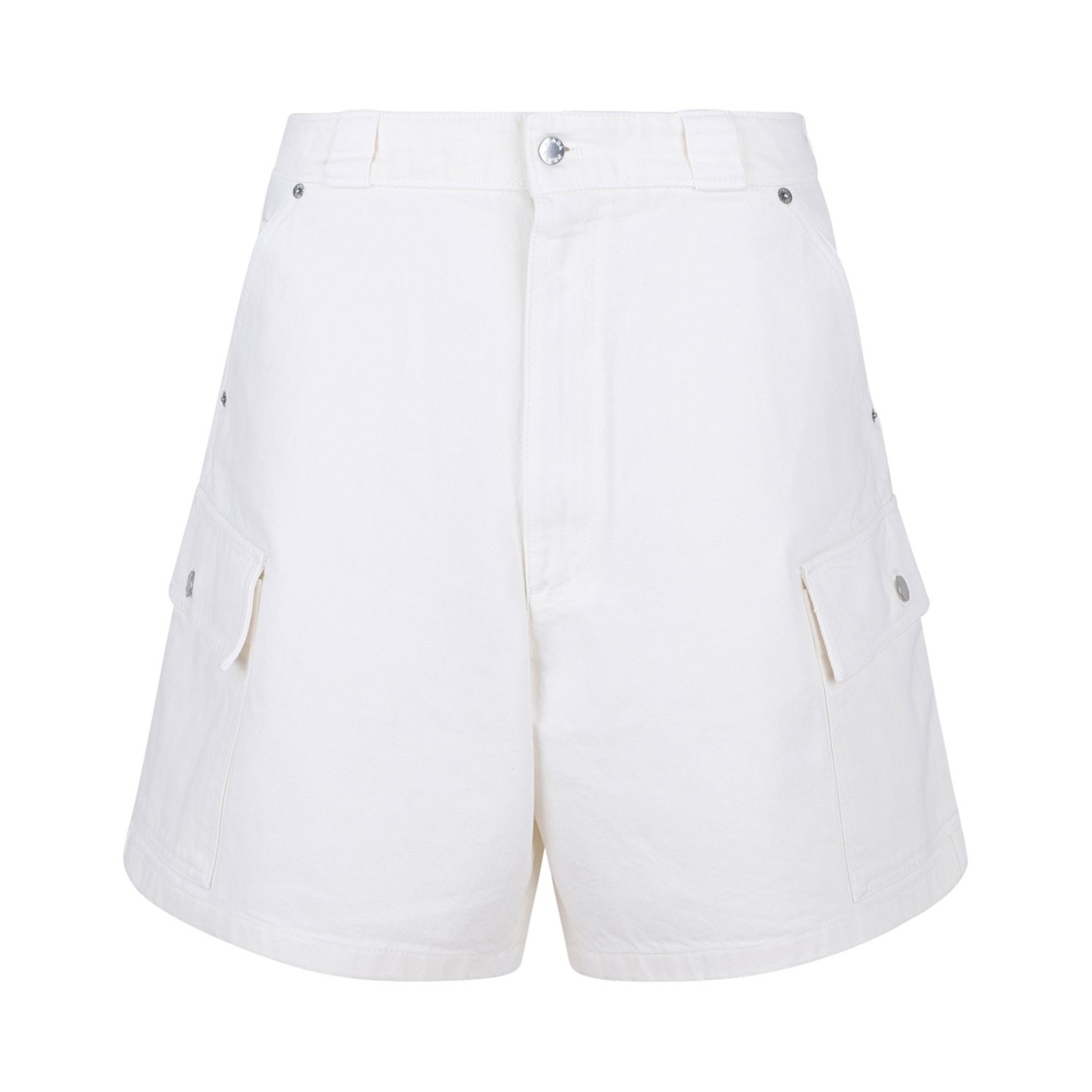 Prada White Triangle Logo Shorts. White cotton short, front button and zip fastening. Two side slash pockets, two side flap pockets, two rear welt pockets.