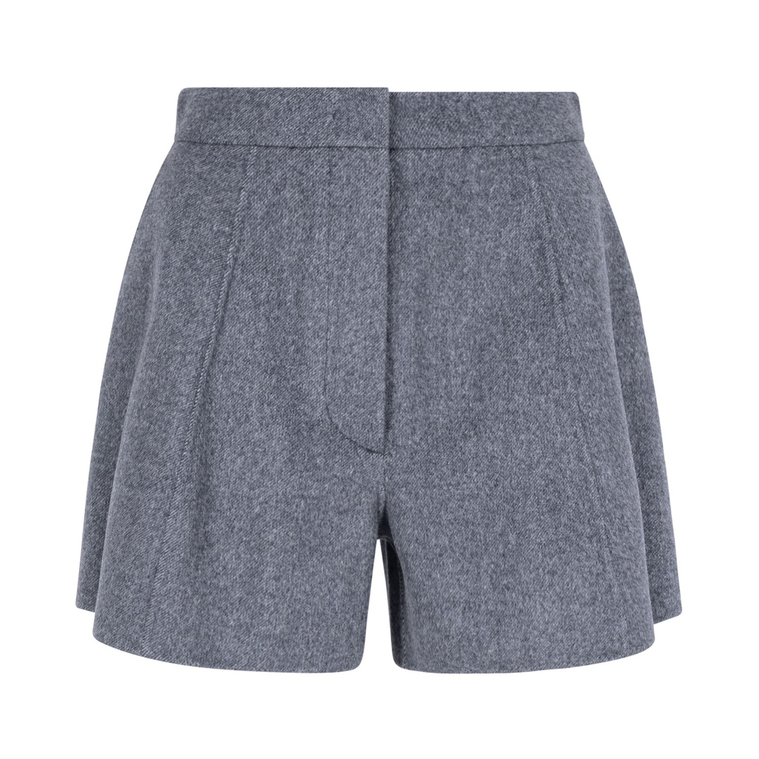 Max Mara Medium Grey Tailored Shorts. Medium grey pure wool double-breasted shorts with low-waisted, inserted side pockets and rear welt pockets. Ironed crease on front and back.