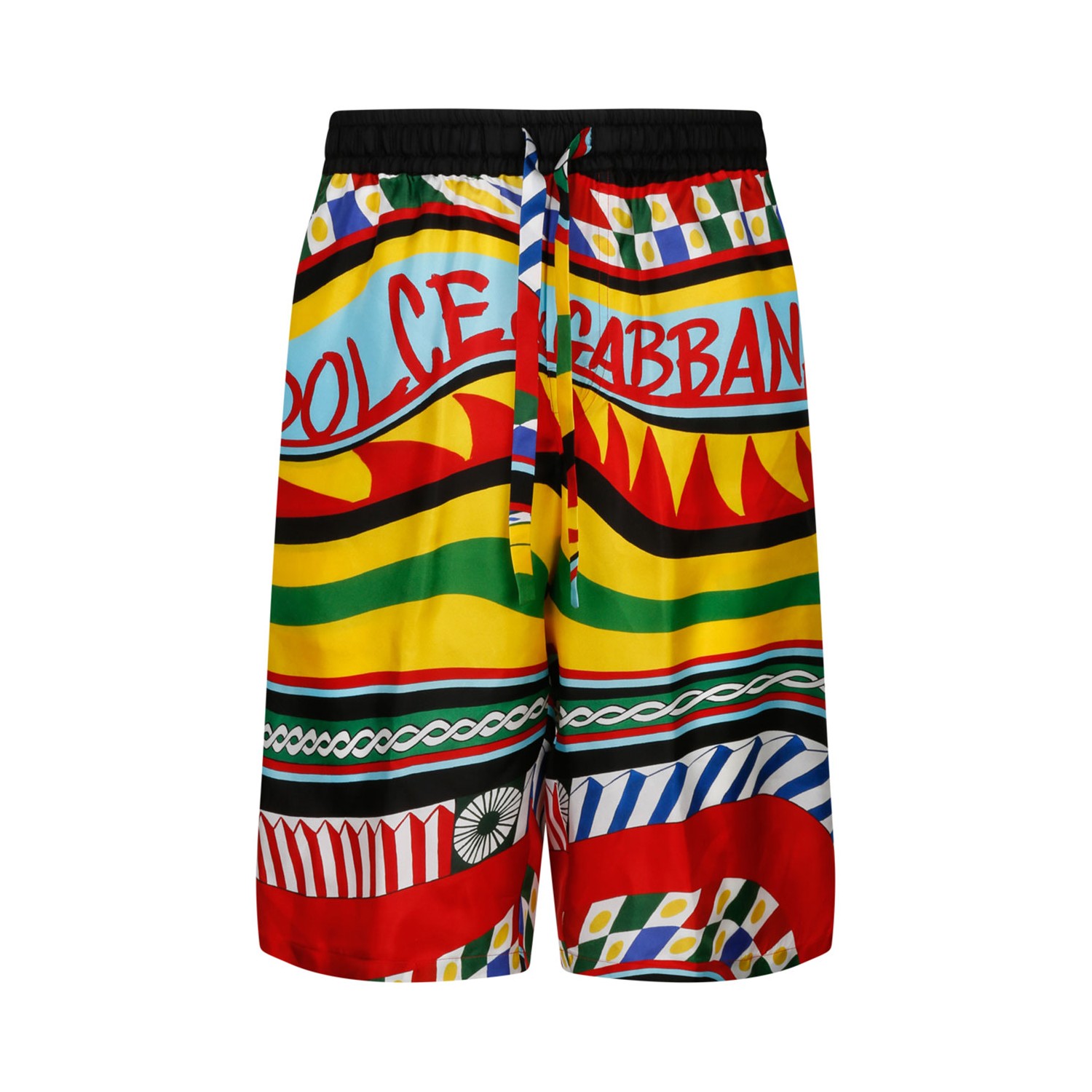 Dolce & Gabbana Multicolour Silk Carreto Print Bermuda Shorts. Multicolour silk Bermuda shorts, all over Sicilian Carretto print, elasticated drawstring waistband, two side inset pockets, knee length.