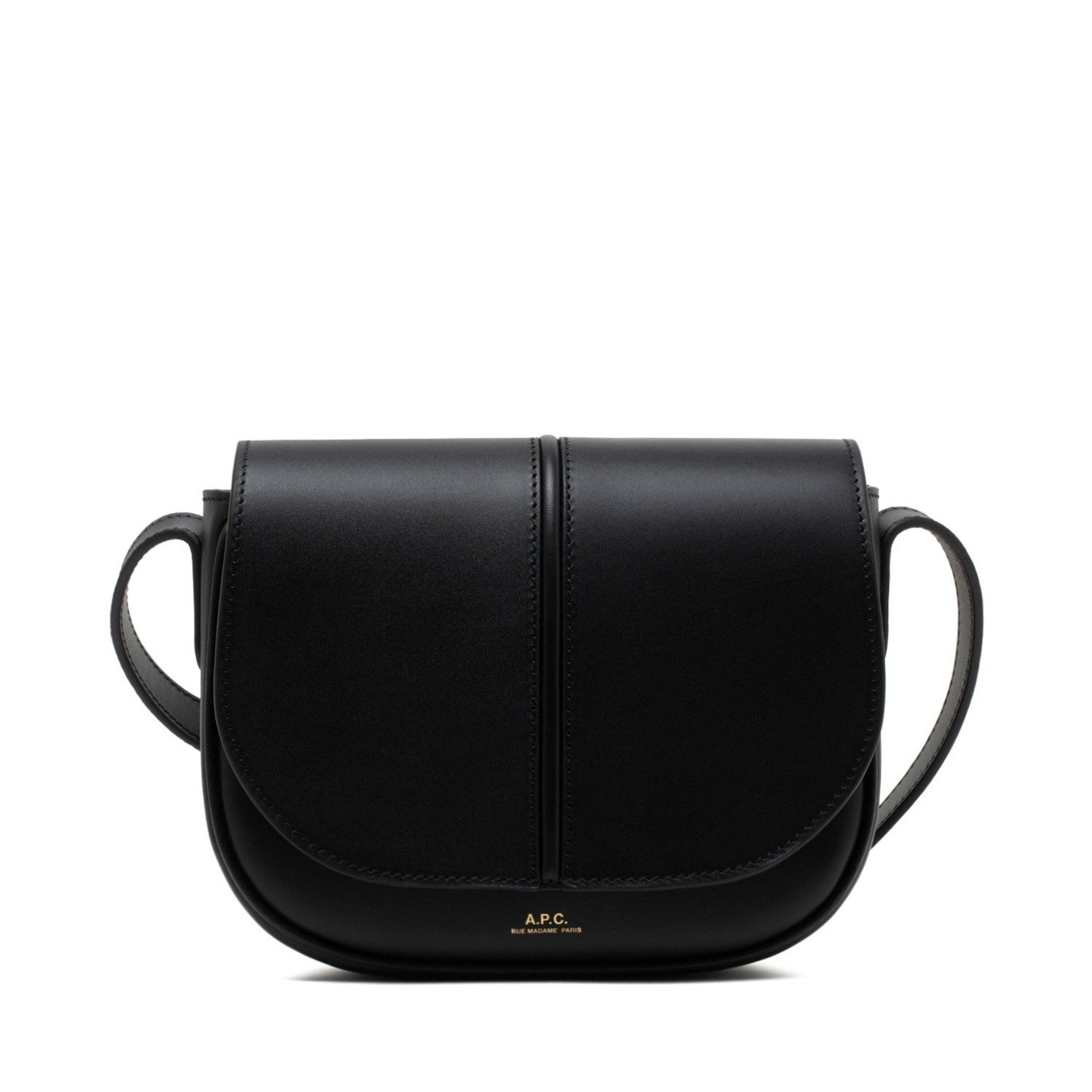 A.P.C. Black Betty Bag. Black smooth vegetable tanned leather shoulder bag, signature trim of the Betty line on the front, magnetic flap closure. Interior pocket, shoulder strap adjusts with a metal buckle, embossed goldtone logo.