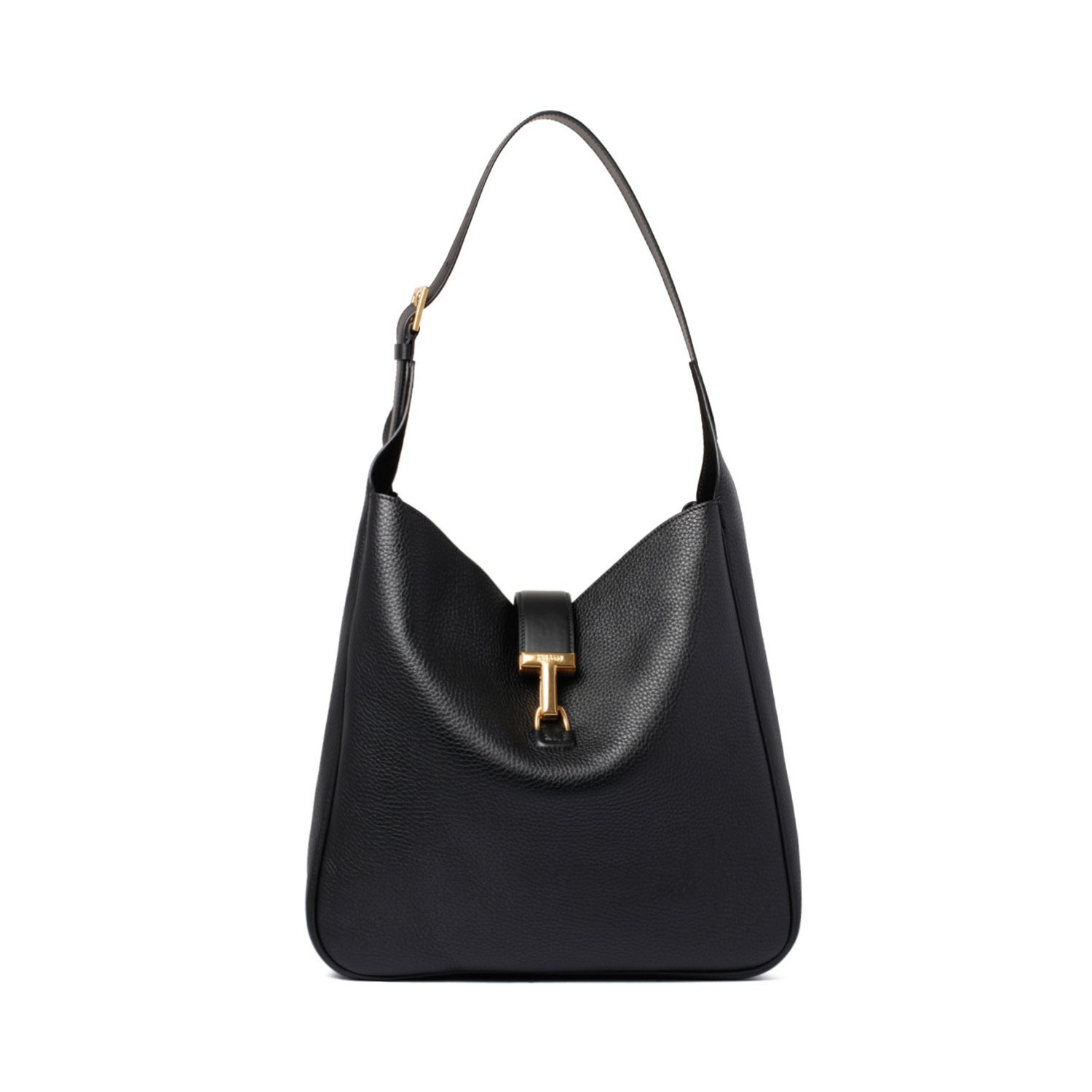 Tom Ford Black Tara Crazy Shoulder Bag. Black calf leather shoulder bag, grained texture, logo engraved gold tone hardware. Foldover strap with signature Double T clip on fastening, adjustable shoulder strap, main compartment. Debossed internal logo, internal zip fastening pocket, internal slip pocket. Gold tone hardware, full lining.