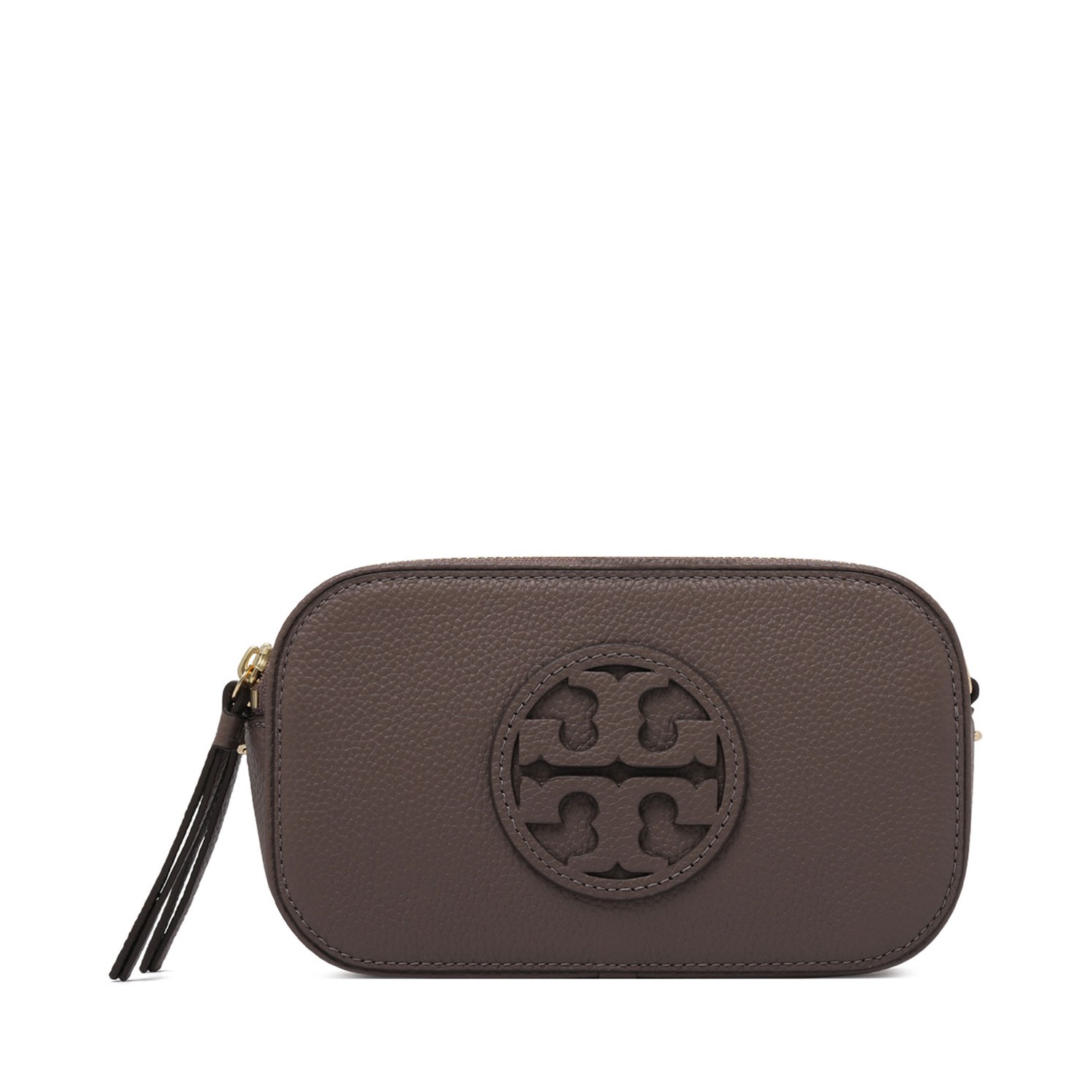 Tory Burch Brown Miller Mini Crossbody Bag. Brown lambskin crossbody bag, embossed logo on the front, adjustable and removable shoulder strap, two zipped compartments and internal slip pocket.