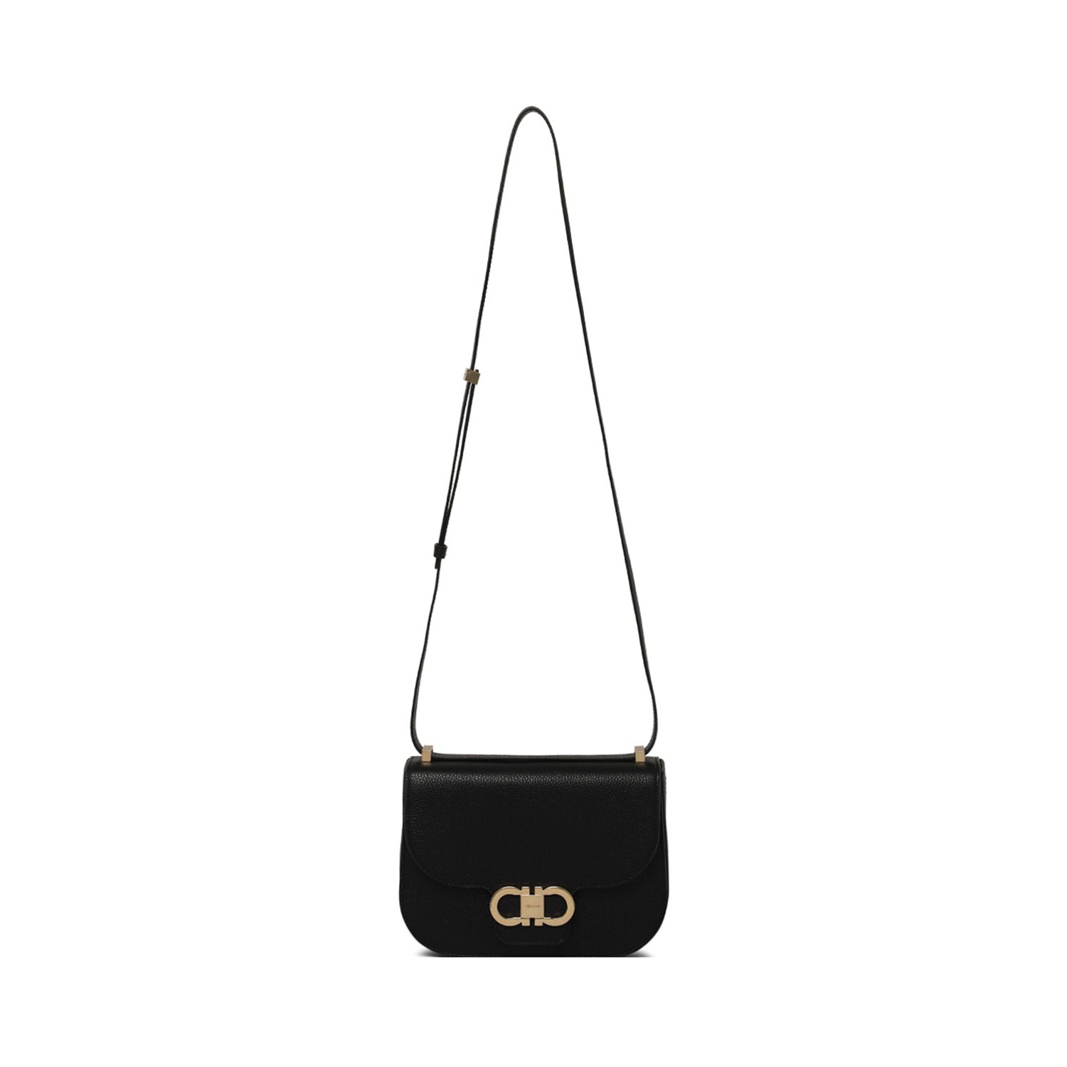 Ferragamo Black Double Gancini Shoulder Bag. Black calfskin shoulder bag, foldover top with magnetic fastening, internal slip pocket, adjustable shoulder strap.