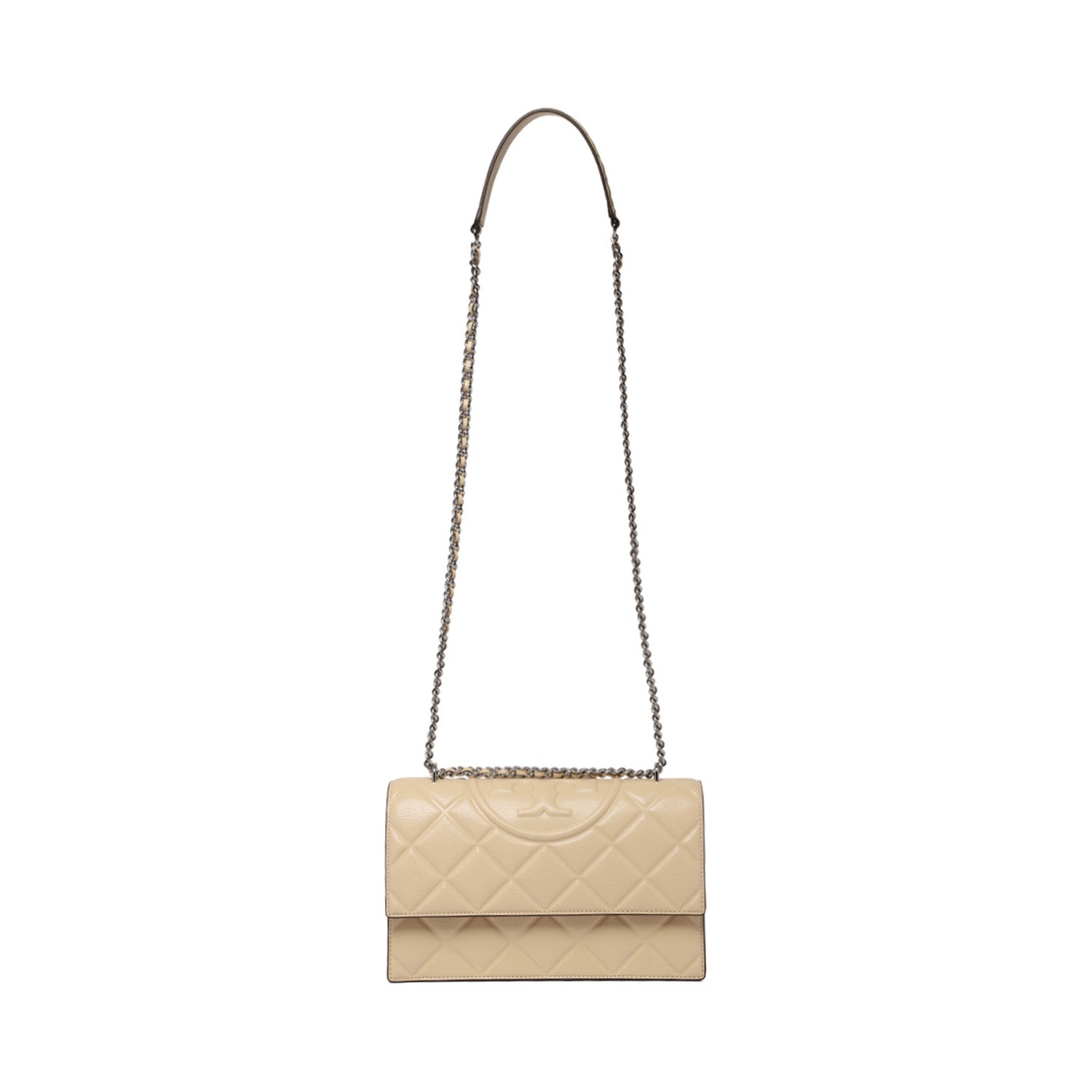 Tory Burch Vanilla Fleming Shoulder Bag. Vanilla leather shoulder bag with foldover top with magnetic fastening. Diamond quilting, signature Double T motif, leather and chain-link shoulder strap. Main compartment, internal zip-fastening pockets, internal slip pocket.