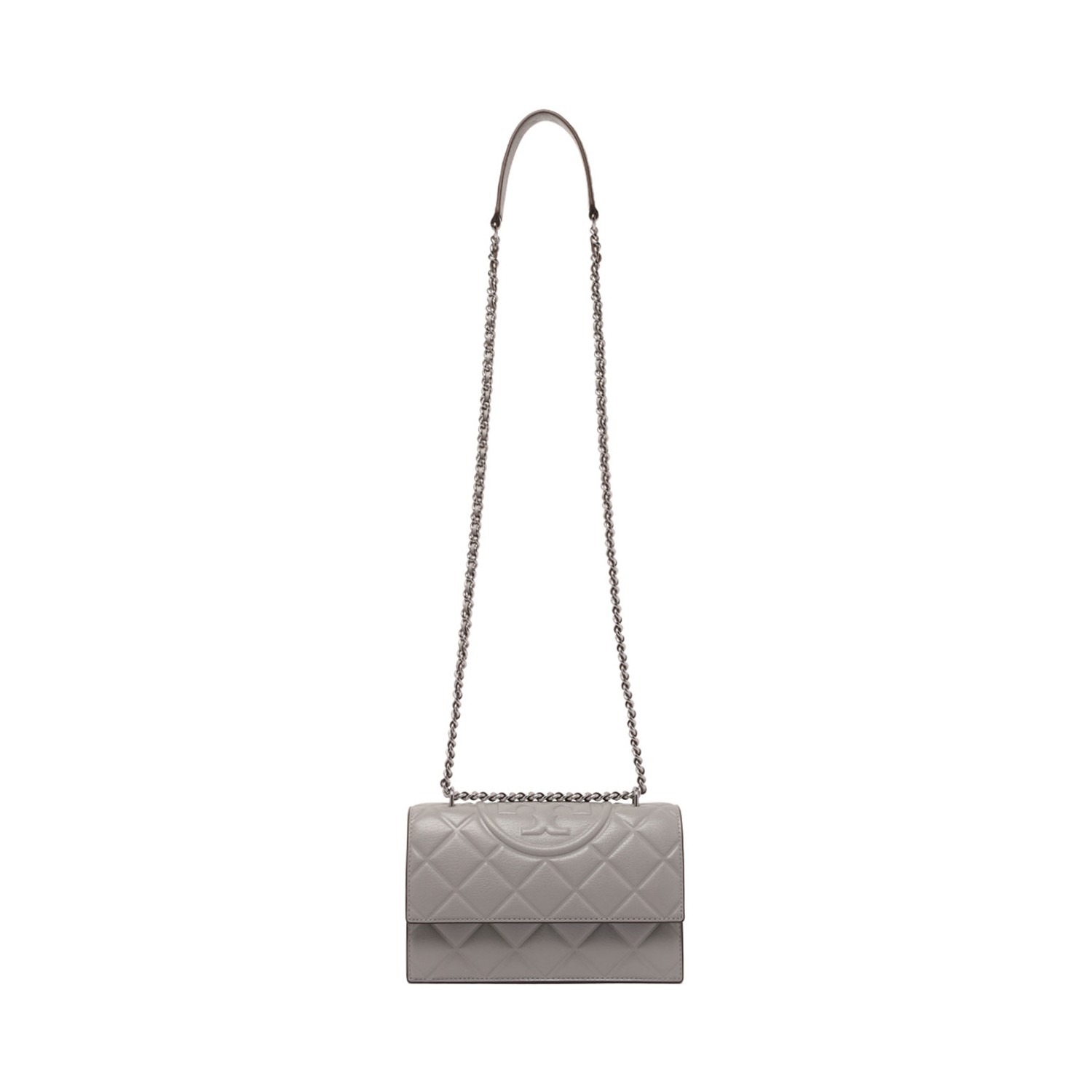 Tory Burch Small Fleming Shoulder Bag. Grey leather shoulder bag, quilted, foldover top with magnetic fastening. Chain-link shoulder strap, embossed logo to the front, main compartment, internal zip-fastening pocket.