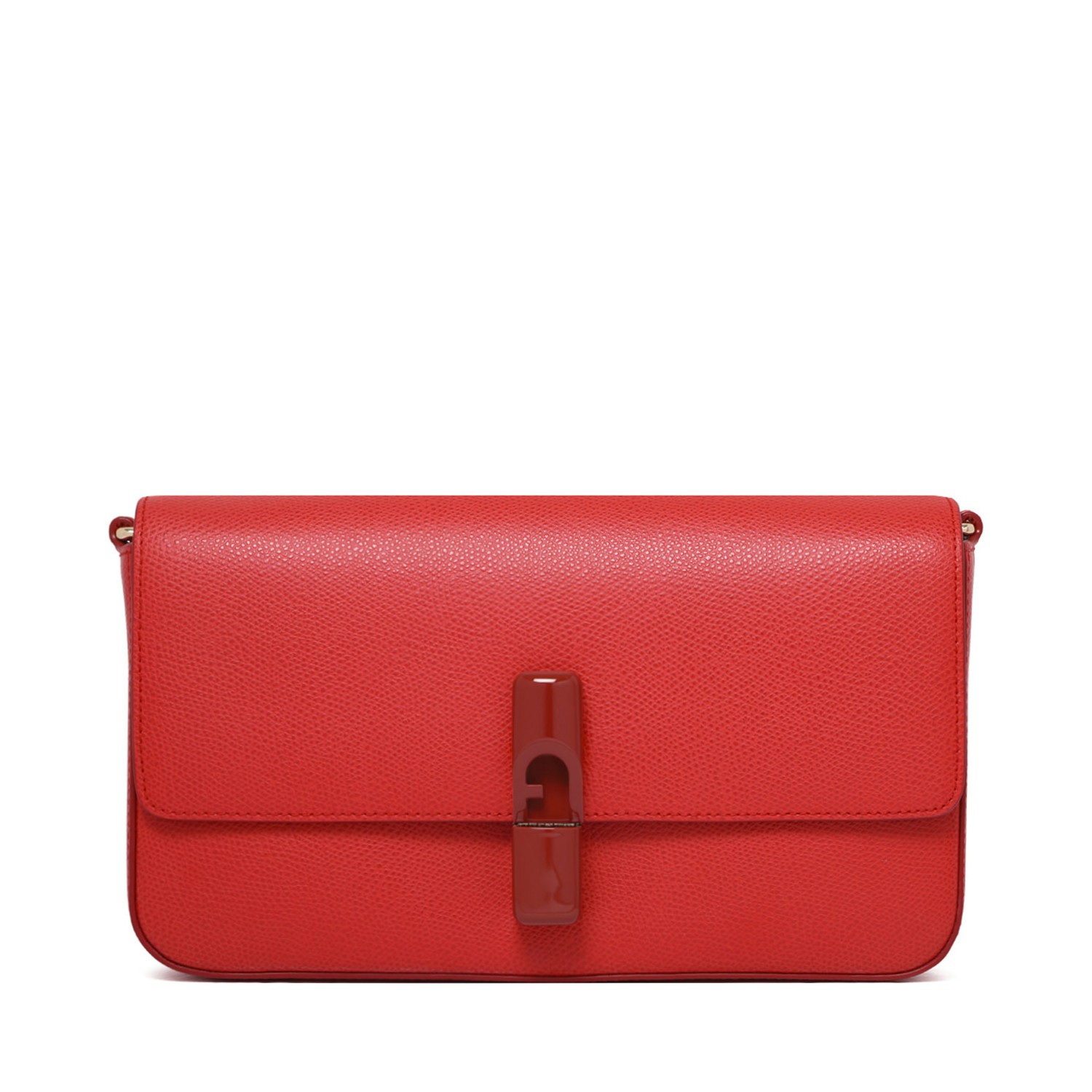 Furla Iride Ruby Shoulder Bag S. Ruby premium hammered leather shoulder bag with adjustable and removable shoulder strap, magnetic closure is embellished with cylindrical metal hardware signed with the iconic Arco Furla logo. Internal pocket with zip closure, printed Furla logo.