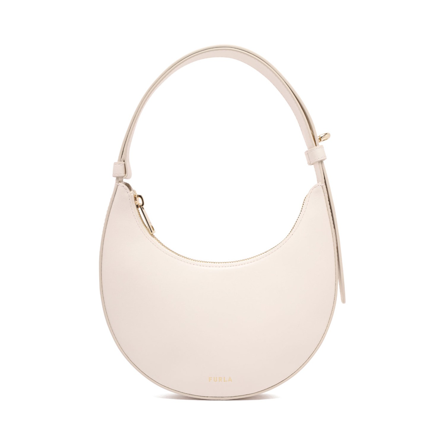 Furla Cream White Mini Delizia Shoulder Bag. Cream white calf leather mini shoulder bag, gold tone hardware, logo print to the front. Adjustable shoulder strap, top zip fastening, internal card slots, internal logo patch. Main compartment, full lining.