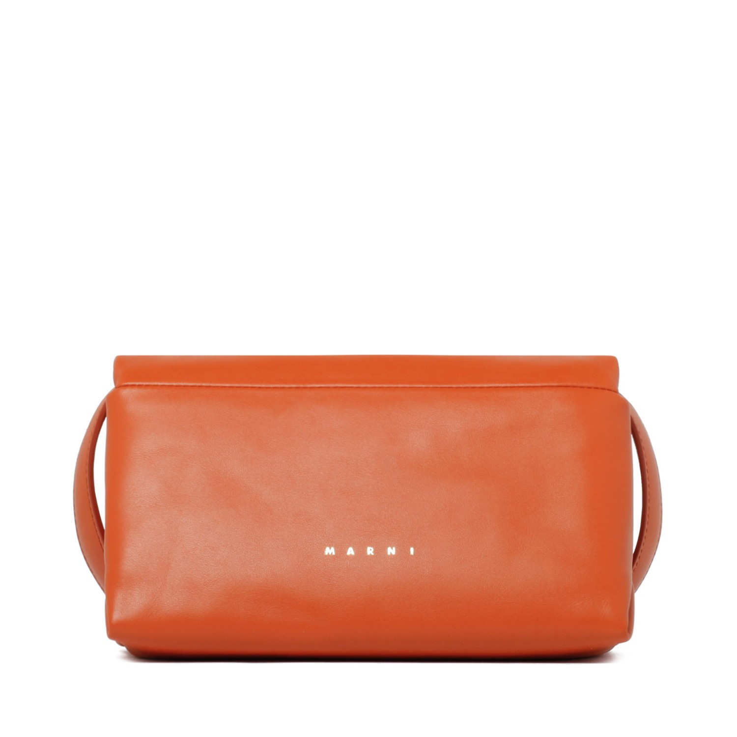 Marni Sunset Orange Calf Leather Small Prisma Shoulder Bag. Sunset orange calf leather shoulder bag, gold tone hardware, front flap closure, clasp fastening, internal zip fastening, full lining, partitioned compartment, embossed logo to the rear, adjustable shoulder strap.