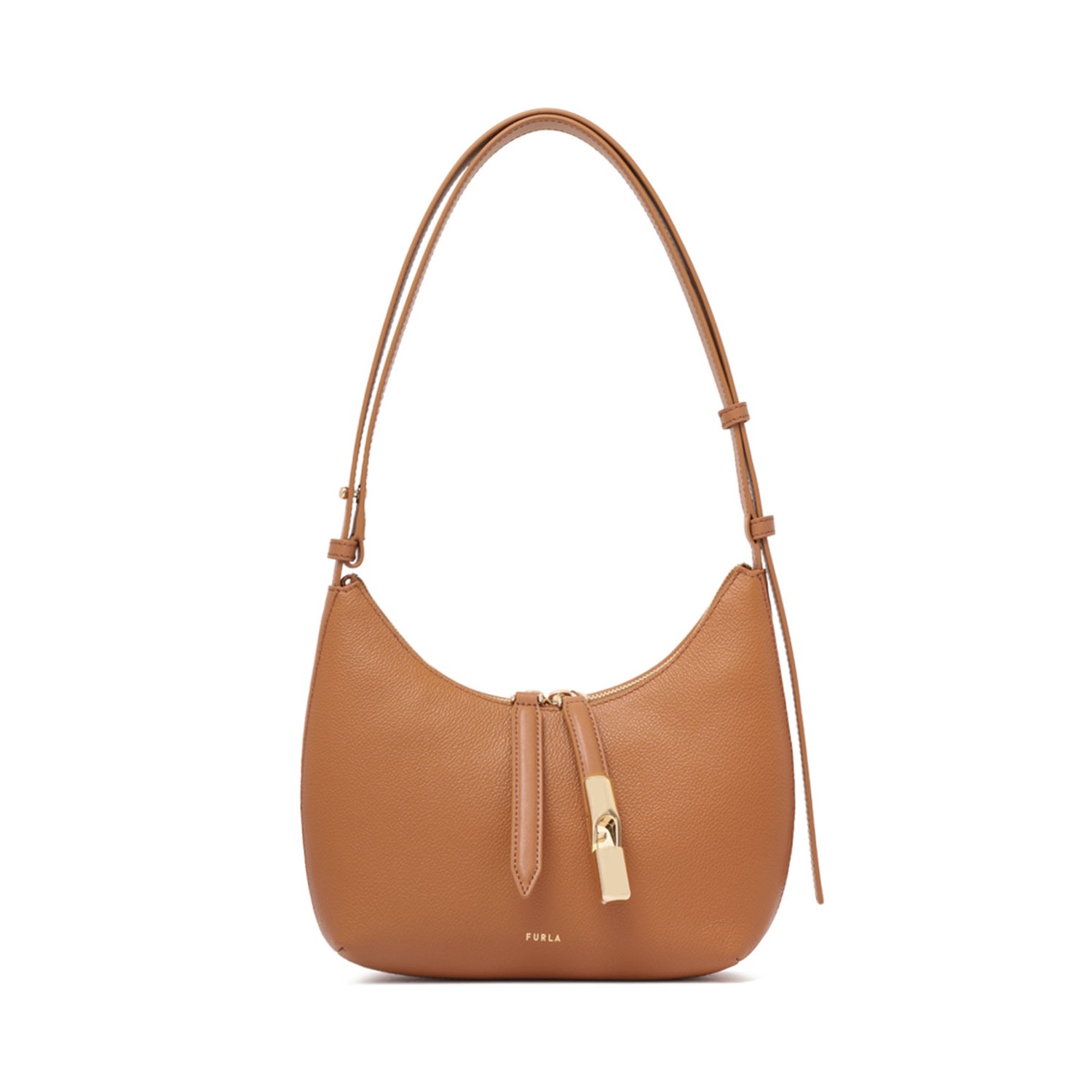 Furla Brandy Small Goccia Shoulder Bag. Brandy calf leather shoulder bag, grained texture, two way top zip fastening, adjustable shoulder strap. Logo engraved, gold tone hardware, logo stamp to the rear. Main compartment, internal slip pocket, internal zip fastening pocket, internal logo patch.