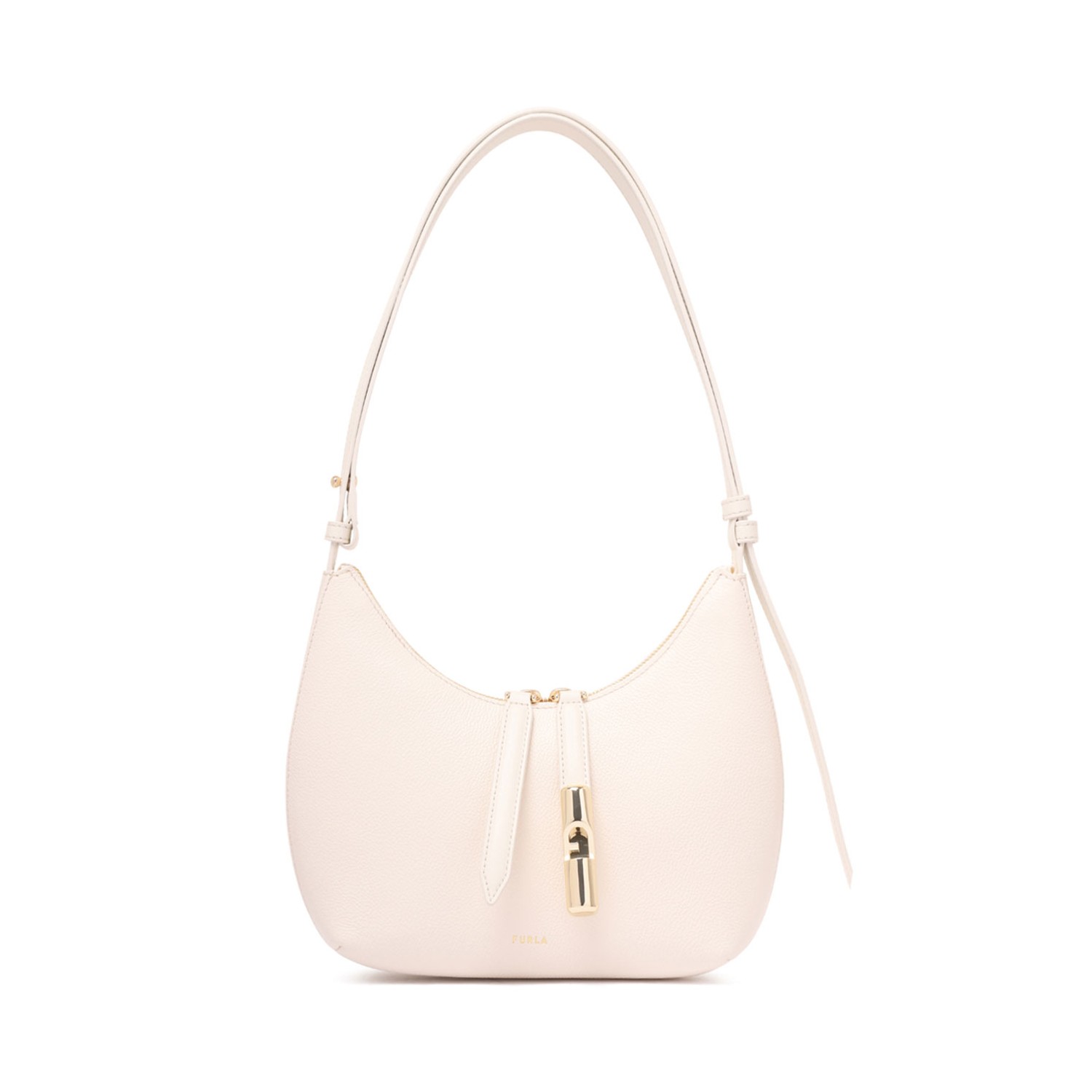 Furla White Small Goccia Shoulder Bag. White calf leather shoulder bag, grained texture, two way top zip fastening, adjustable shoulder strap. Logo engraved, gold tone hardware, logo stamp to the rear. Main compartment, internal slip pocket, internal zip fastening pocket, internal logo patch.