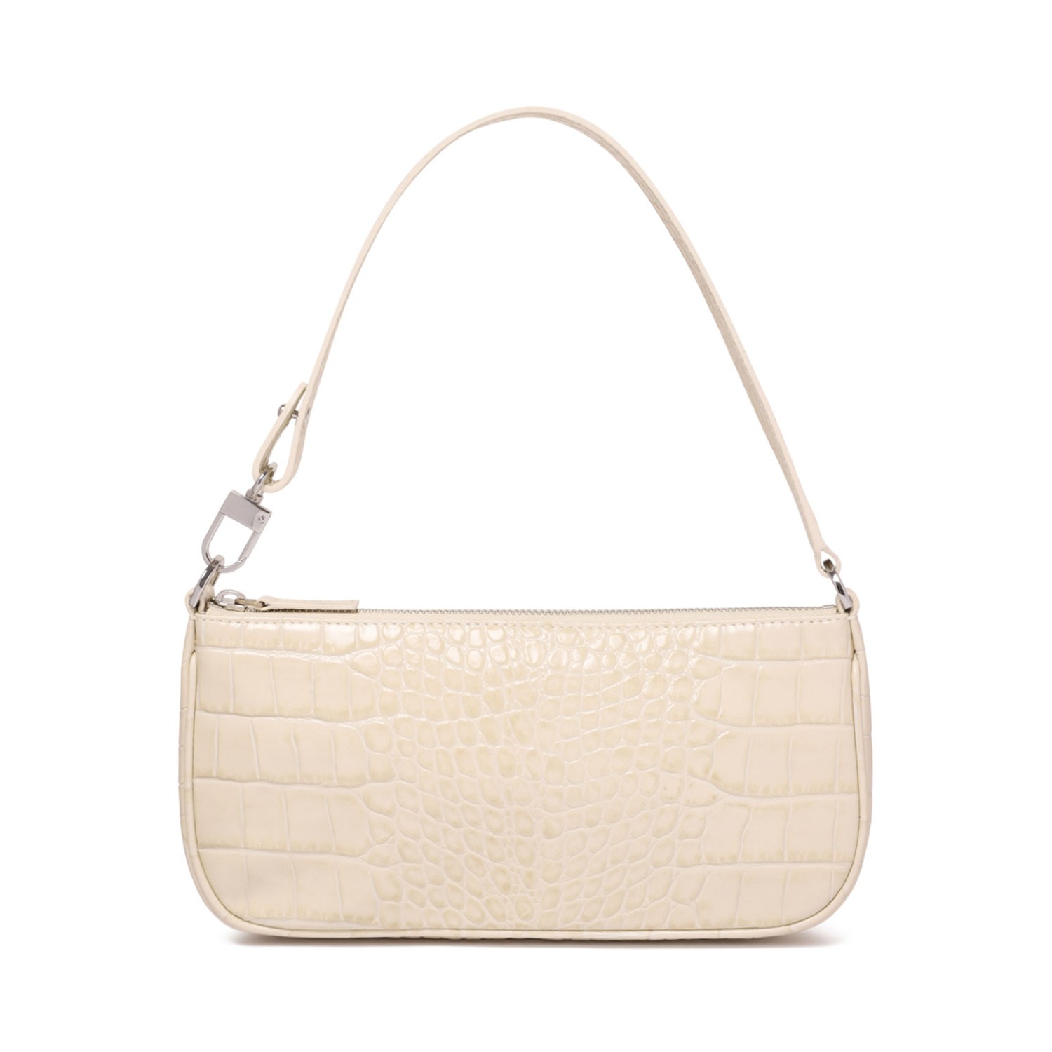By Far Cream Rachel Crocodille-Effect Shoulder Bag. Cream crocodile effect shoulder bag with rectangle shape, main compartment, top handle.