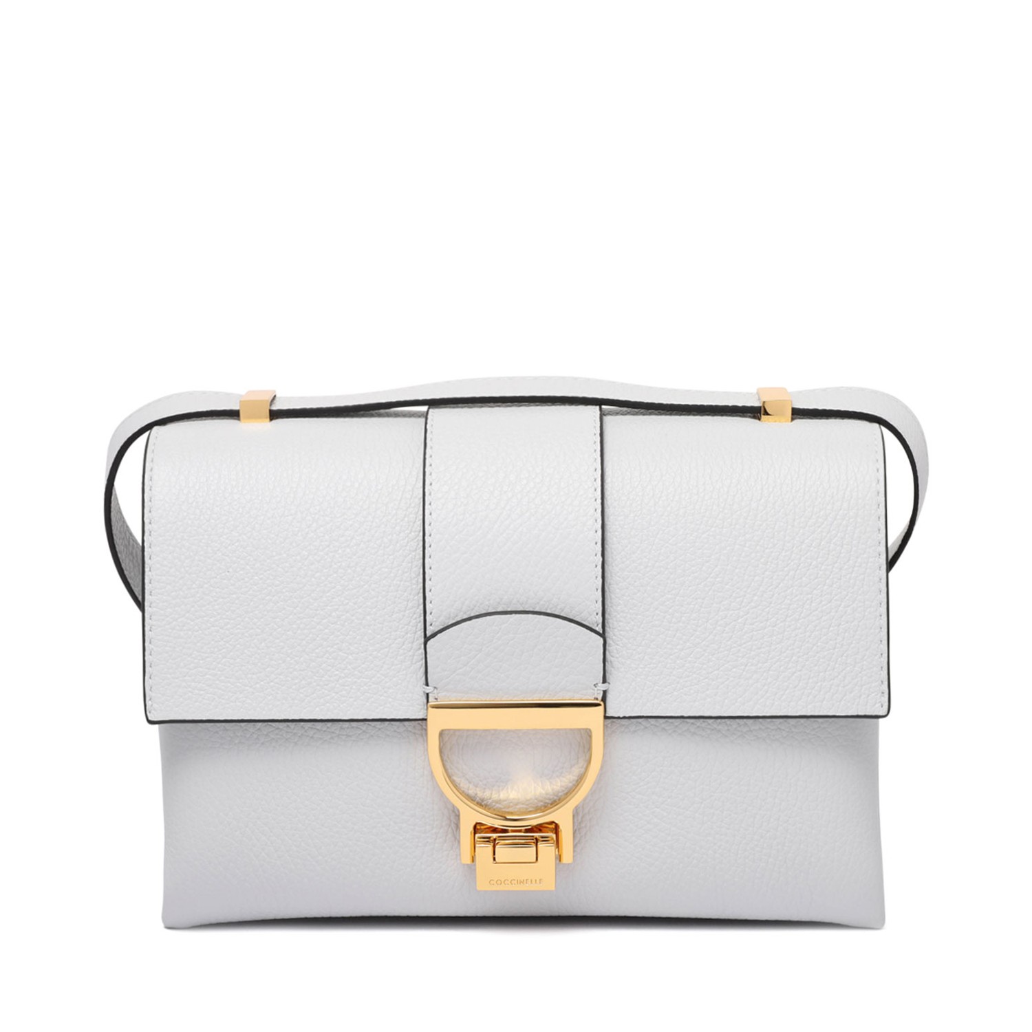 Coccinelle White Snow Arlettis Shoulder Bag. White snow leather with grain, swing closure, three internal compartments, eco-leather interior, adjustable shoulder strap with cufflinks.