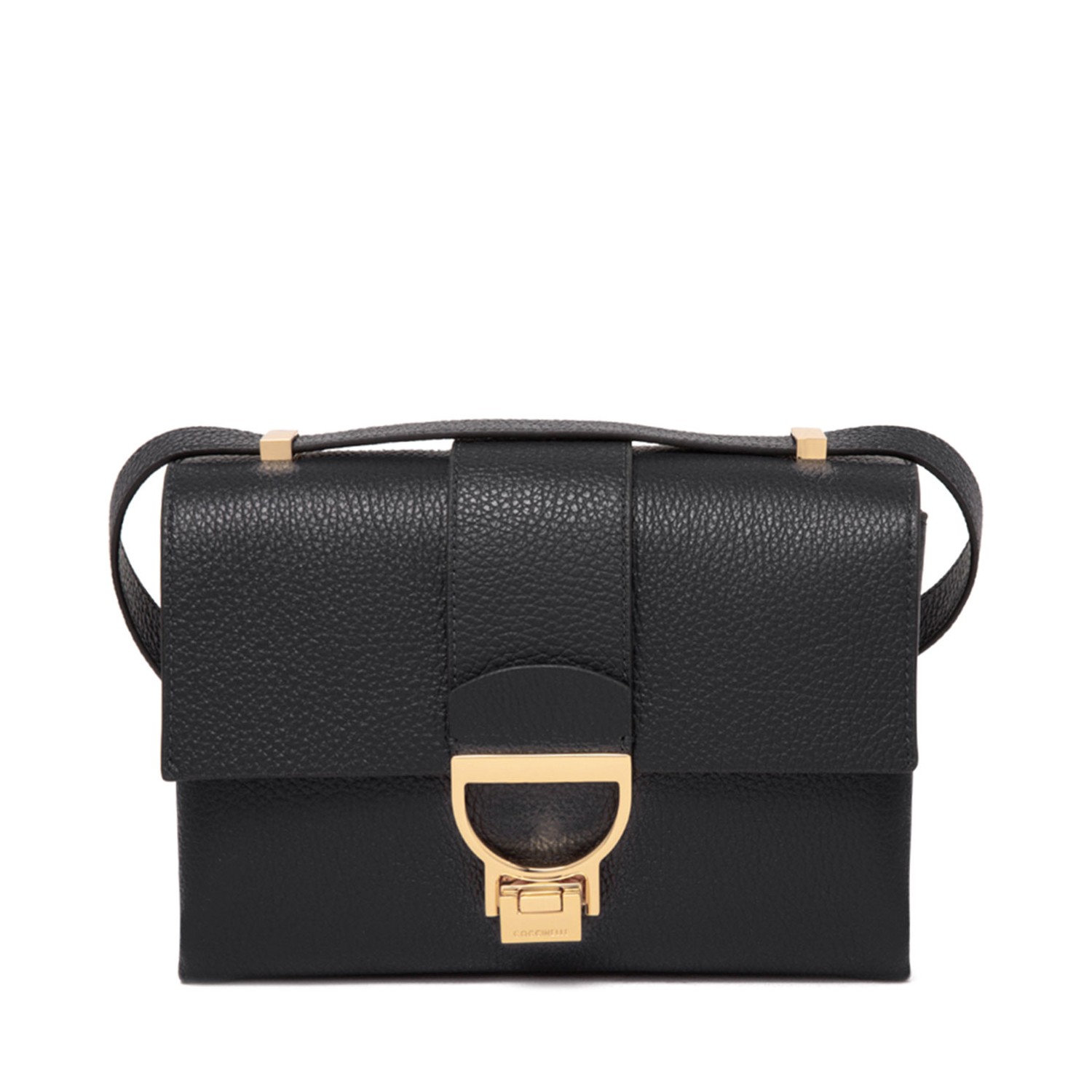 Coccinelle Black Arlettis Shoulder Bag. Black leather with grain, swing closure, three internal compartments, eco-leather interior, adjustable shoulder strap with cufflinks.