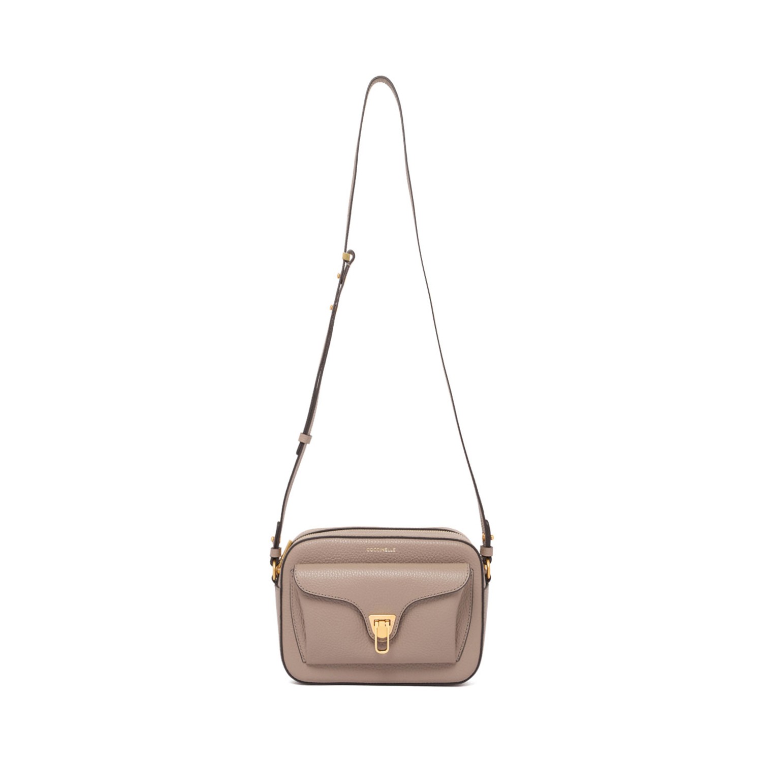 Coccinelle Warm Taupe Beat Soft Crossbody Bag. Warm taupe crossbody bag in grained leather with galvanised old gold details. Fabric interior with zipped pocket. Iconic golden clasp. Logo with gold stamp. Adjustable shoulder strap.