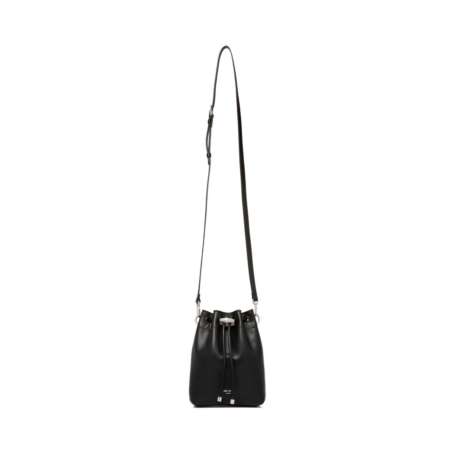 Jimmy Choo Black Cinch Mini Leather Bag. Black leather mini bag with drawstring closure, detachable shoulder strap. Effortless silhouette that is cinched by a faceted Diamond drawstring closure.
