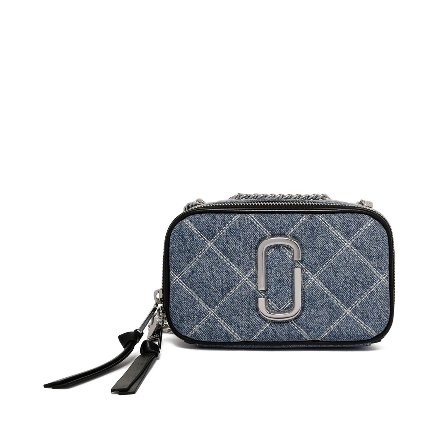 Marc Jacobs The Quilted Denim Softshot Bag. Light wash indigo bag in cotton denim with dual top zipper, pull through leather and chain starp. One external slip pocket, twill lining.