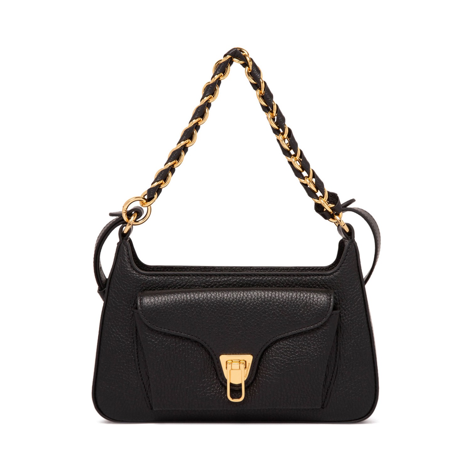 Coccinelle Black Leather Shoulder Bag with Chain Detail. Black shoulder bag in grained leather featuring a structured silhouette with a front flap pocket and gold-tone turn-lock closure. Designed with a luxurious leather-and-chain top handle interwoven with black leather, and an adjustable, detachable crossbody strap for versatile styling. The main compartment has a clean top opening and is perfect for daily essentials.