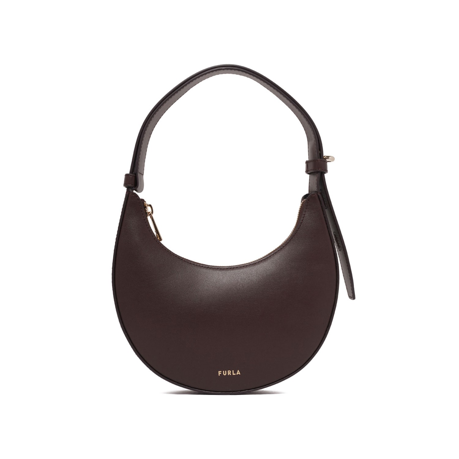 Furla Chocolate Mini Delizia Shoulder Bag. Chocolate calf leather mini shoulder bag, gold tone hardware, logo print to the front. Adjustable shoulder strap, top zip fastening, internal card slots, internal logo patch. Main compartment, full lining.