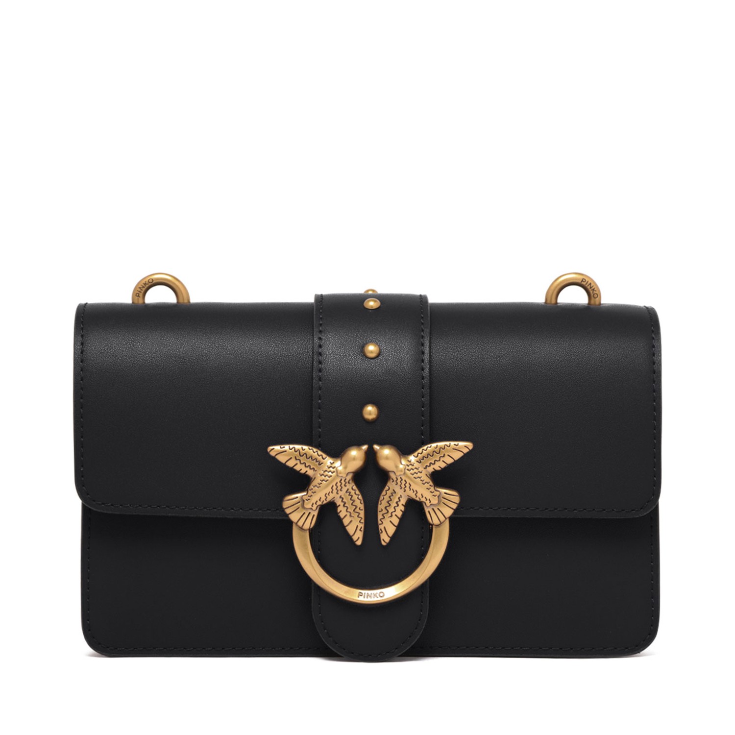 Pinko Black Love One Chain Shoulder Bag. Black leather shoulder bag with Love Birds plaque, chain strap, flap closure and studded detailing.