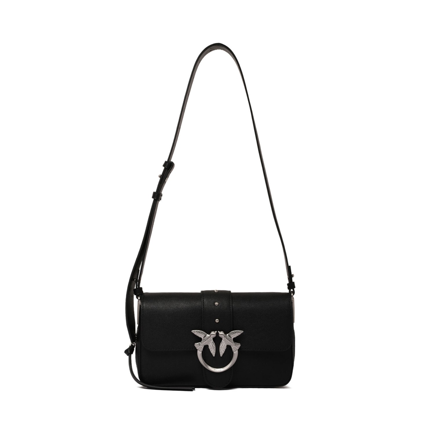 Pinko Black Mini Love One Crossbody Bag. Black mini crossbody bag with foldover top with magnetic fastening, adjustable shoulder strap. Internal zip-fastening pocket, signature Love Birds buckle.