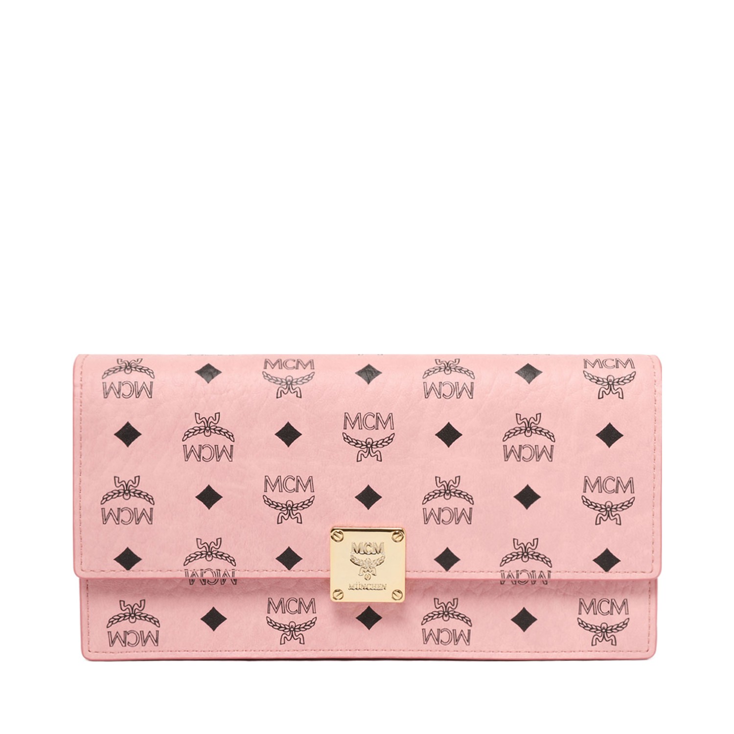 MCM Light Pink Monogram Print Shoulder Bag. Light pink calf leather shoulder bag with foldover top with magnetic fastening, detachable shoulder strap, internal zip-fastening pocket and main compartment.