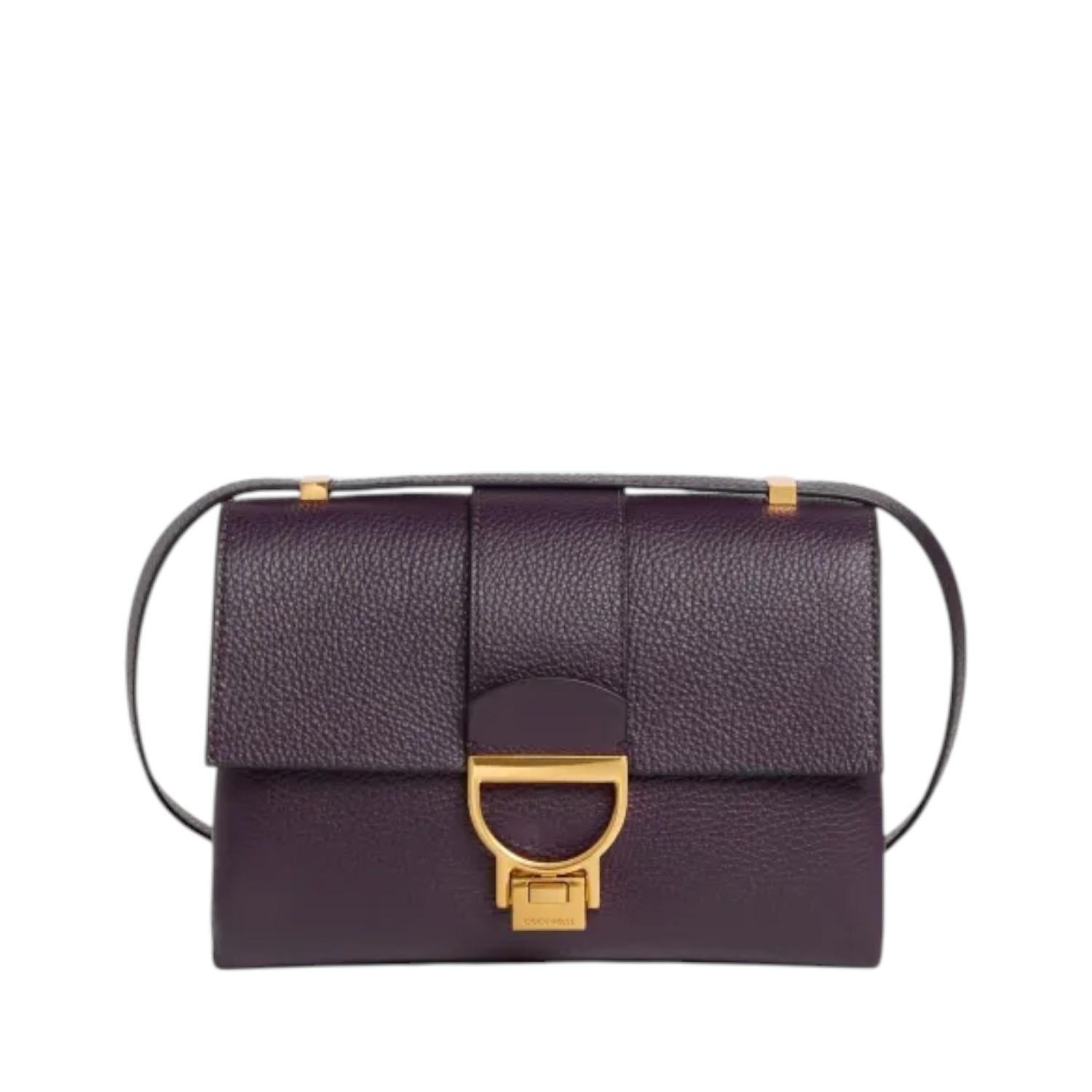 Coccinelle Prune Arlettis Shoulder Bag. Prune leather with grain, swing closure, three internal compartments, eco-leather interior, adjustable shoulder strap with cufflinks.