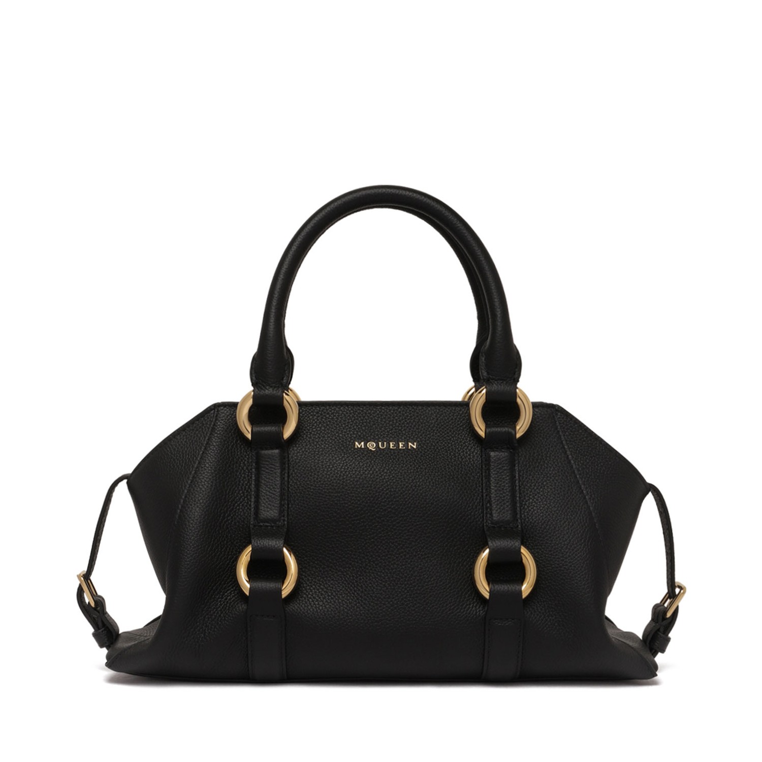 Alexander McQueen Black Small Farringdon Bag. Black small bag with adjustable side straps, McQueen logo embossed in foil on the front dial, zip closure. One main compartment with a flat leather pocket and round metal rings with a shiny gold finish.