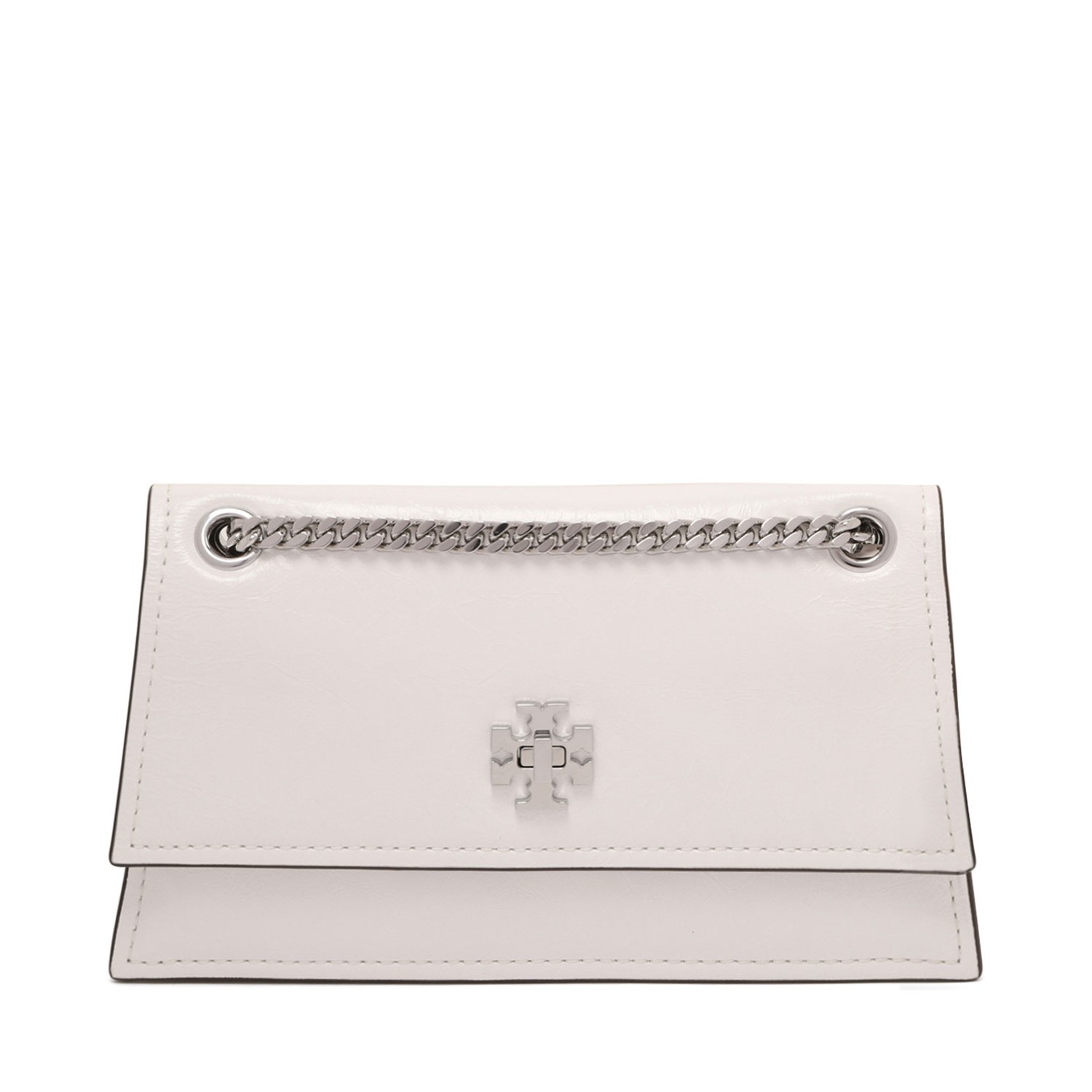 Tory Burch White Kira Turnlock Mini Bag. White napa leather mini shoulder bag with flap with turnlock closure, onvertible chain shoulder strap with drop fully extended, one interior pocket.