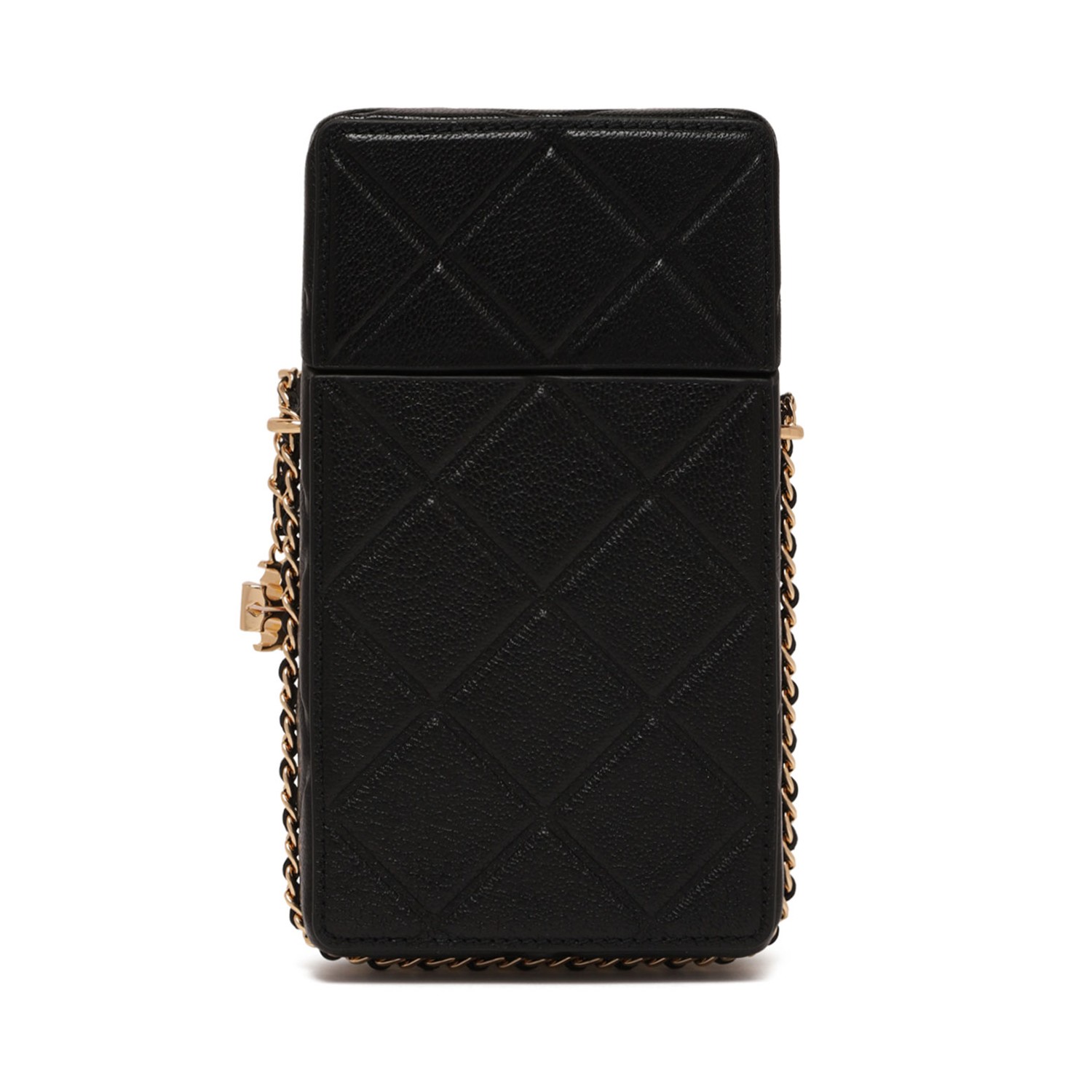 Tory Burch Black Fleming Phone Crossbody. The Fleming Phone Crossbody is designed with a debossed diamond pattern. Finished with a logo charm, the structured shape keeps essentials close. Crafted in partnership with a Leather Working Group-certified tannery, supporting high standards in leather manufacturing and chemical management.
