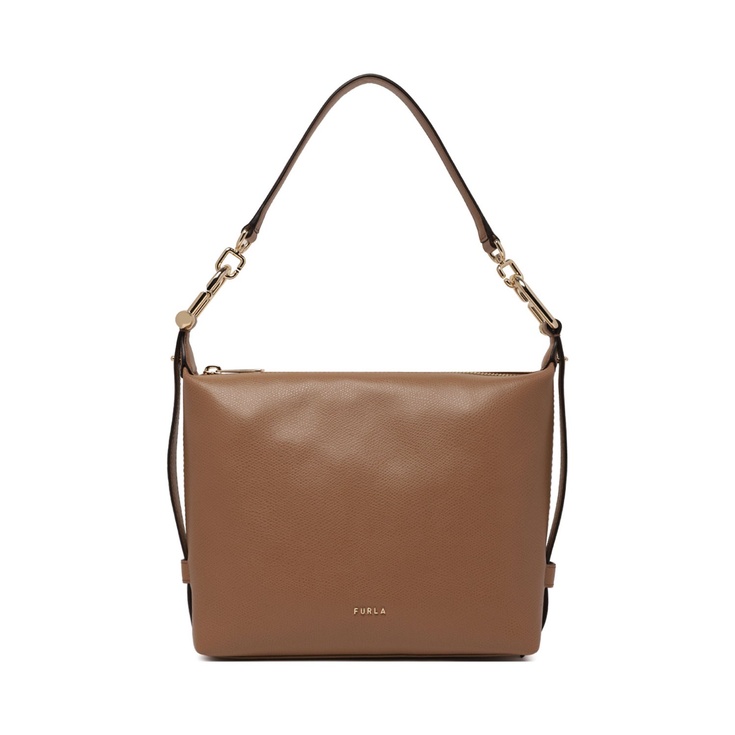 Furla Toffee Tonie Mini Shoulder Bag. Tonie hobo bag features a miniature format in fine printed leather. Featuring two shoulder straps of different lengths, it can be worn over the shoulder or crossbody. By removing the handle, the two Arco logo-shaped elements can be attached together for a new and distinctive top handle version.