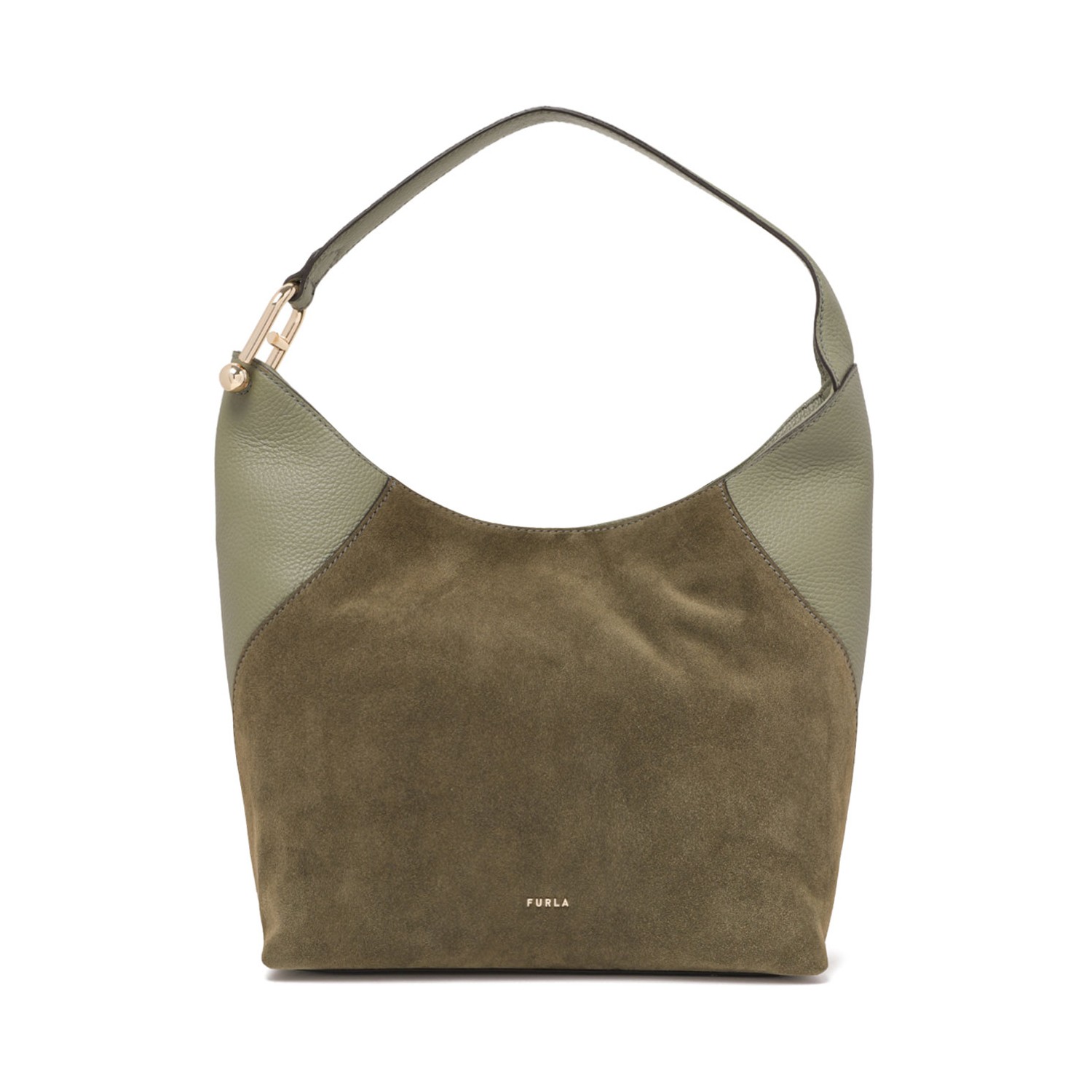 Furla Avocado Lara Shoulder Bag L. Avocado Lara bag stands out for its elegant combination of soft suede and smooth calfskin. This softly structured model has a spacious shape, perfect for carrying all your essentials. The shoulder strap, accented by the iconic Arco logo with a metal sphere, completes the accessory.