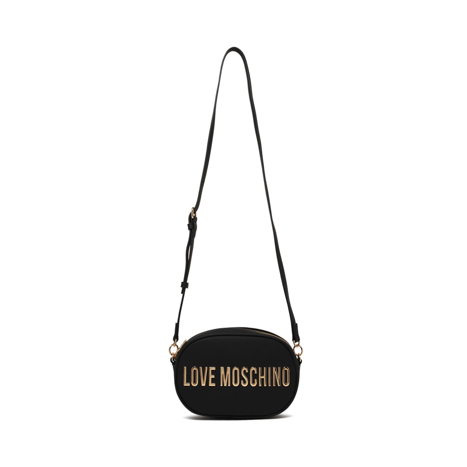 Love Moschino Black Bold Love Faux Leather Shoulder Bag. Black faux leather shoulder bag with closes with zip, adjustable shoulder strap, logo in metal with a shiny gold finish.