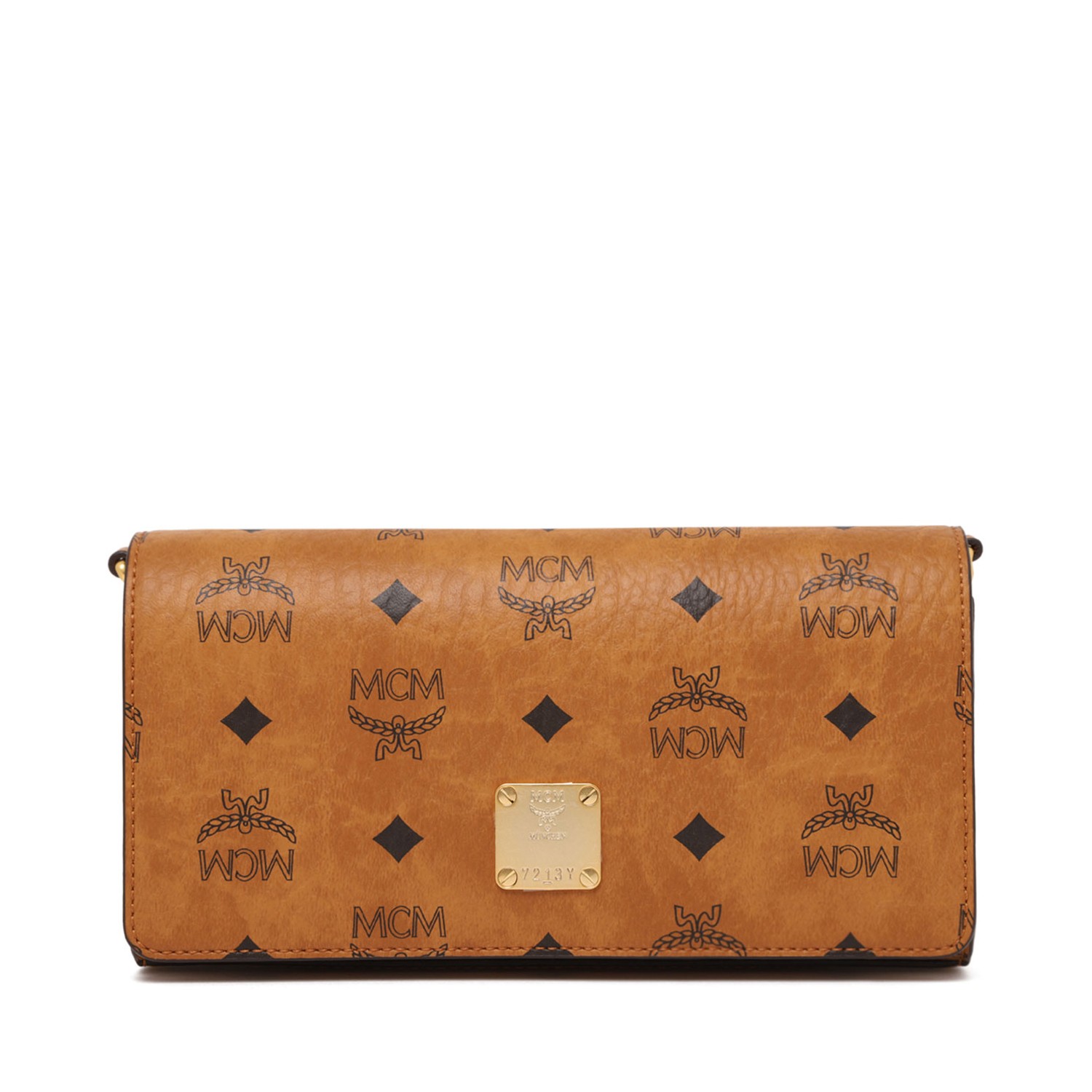 MCM Cognac Aren Shoulder Bag in Visetos. Cognac mini chain shoulder bag is sculpted from classic cognac Visetos and natural nappa leather. A heritage hallmark unique to MCM, the gilded brass logo plate adorns the front of the silhouette.
