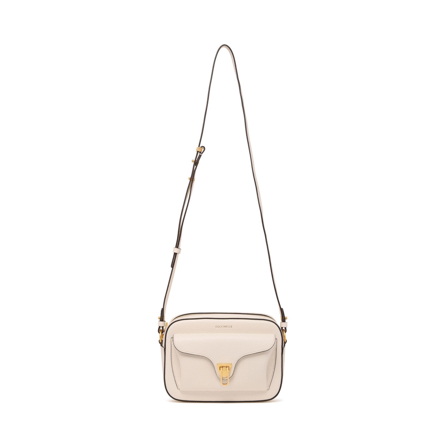 Coccinelle Pearl Beat Soft Crossbody Bag. Pearl crossbody bag in grained leather with galvanised old gold details. Fabric interior with zipped pocket. Iconic golden clasp. Logo with gold stamp. Adjustable shoulder strap.