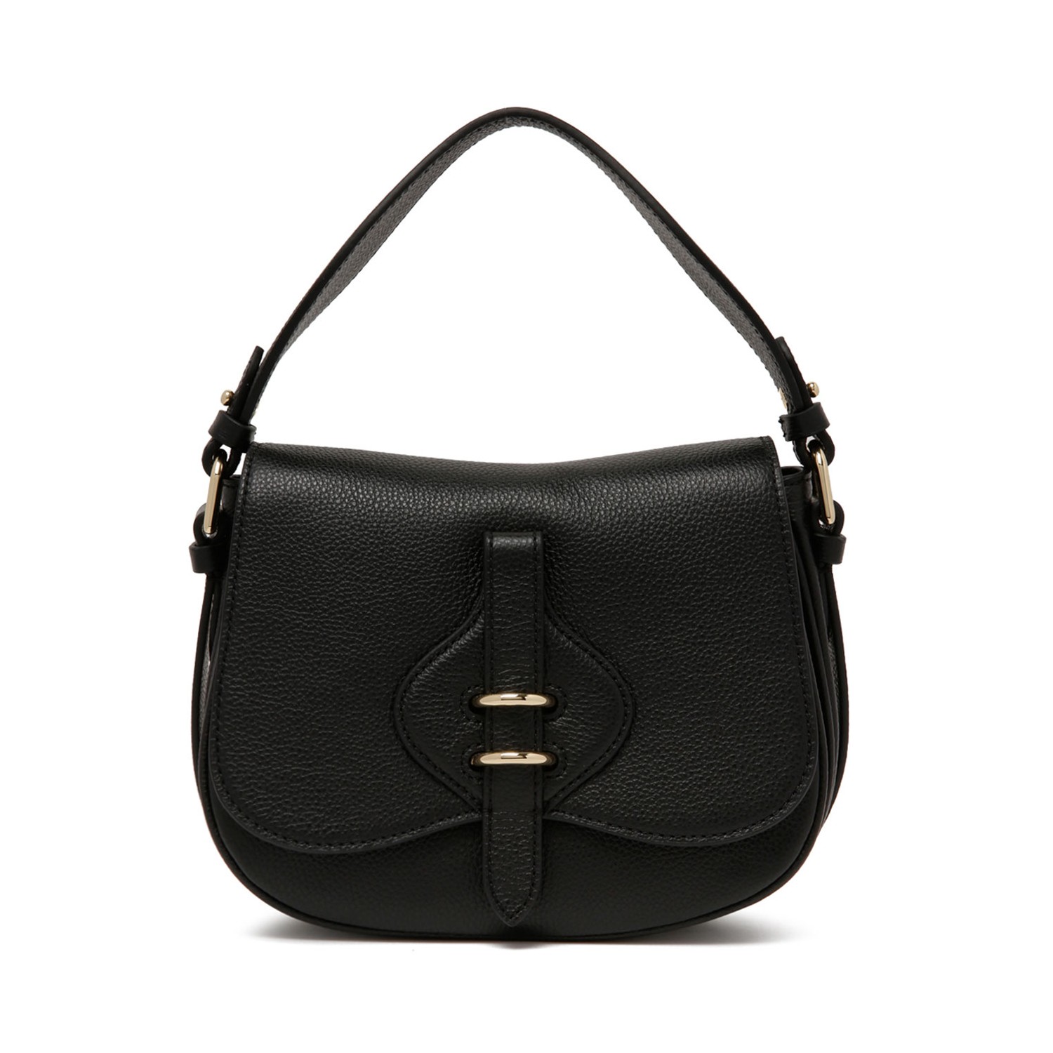 Coccinelle Black Micro-Grained Leather Mavery Small Bag. Black micro-grained leather bag with magnetic closure, removable handle for portability by hand. Removable and adjustable leather shoulder strap, two internal compartments, light gold galvanic, gold stamp logo.