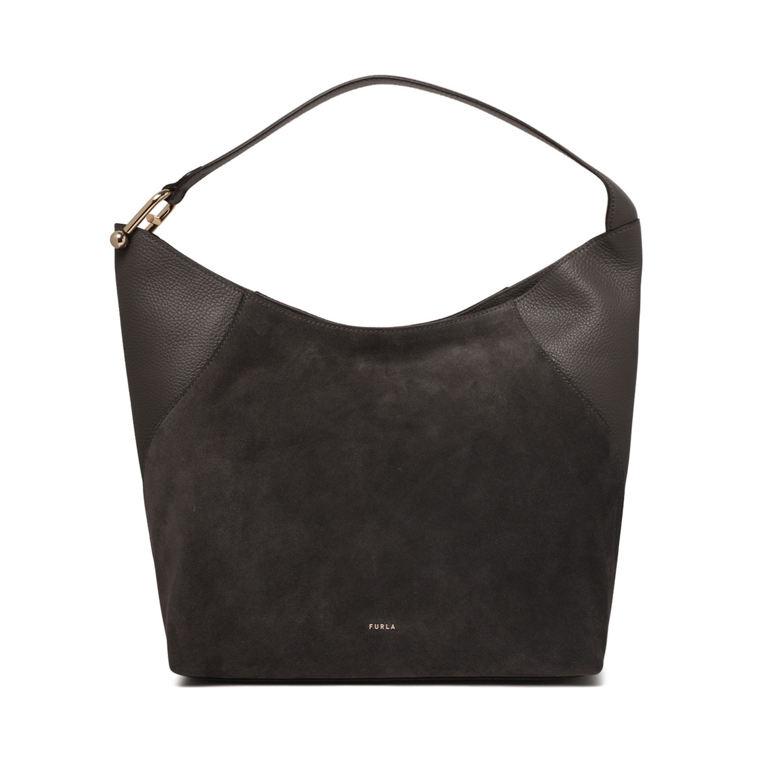 Furla Urban Grey Tone Lara Shoulder Bag L. Urban grey tone Lara bag stands out for its elegant combination of soft suede and smooth calfskin. This softly structured model has a spacious shape, perfect for carrying all your essentials. The shoulder strap, accented by the iconic Arco logo with a metal sphere, completes the accessory.